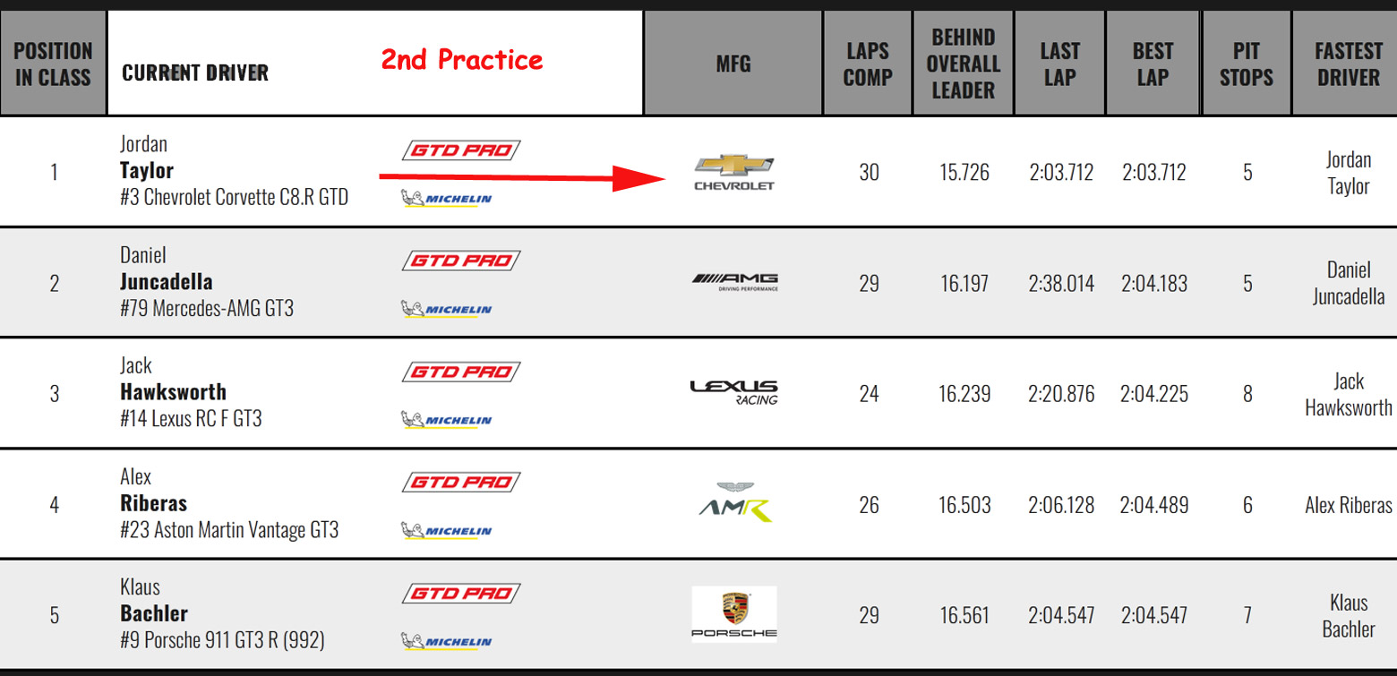 Jordan Taylor topped the time charts in GTD Pro in his No. 3 Chevrolet Corvette C8.R GTD, thanks to a 2:03.712 lap time in the final moments of the session.