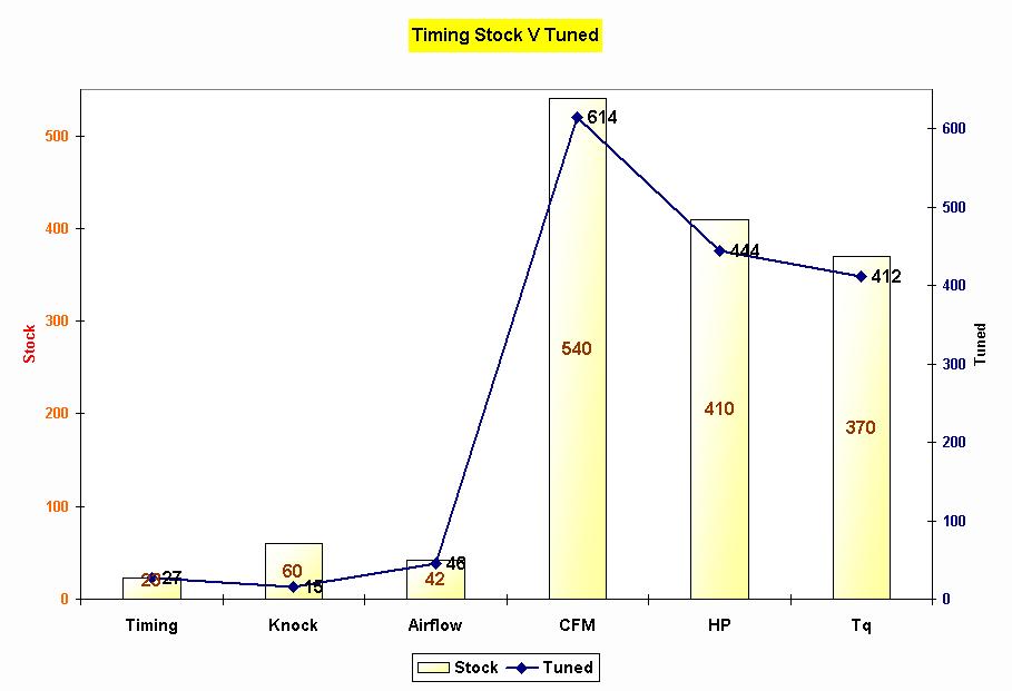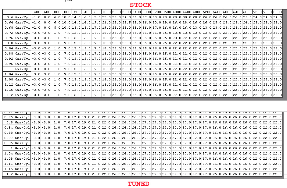Review that values and results below but at the least if the stock timing is only increased 4 degrees of timing with other functions properly tuned you see higher performance, engine taking in more air and still even less knock occuring.