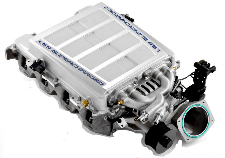 Beneath the plastic breastplate atop the 6.2-liter LS9 is an assembly integrating a supercharger, intake manifold and liquid-to-air intercooler into a single unit.