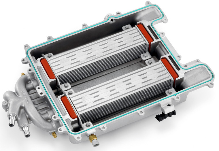 Hot, compressed intake air discharges from the supercharger straight up and then splits into two paths. Each flow stream makes a U-turn through an intercooler core and then travels down into the intake ports. A smallish auxiliary radiator will be mounted in the nose of the ZR1 to cool the liquid pumped into the intercooler.