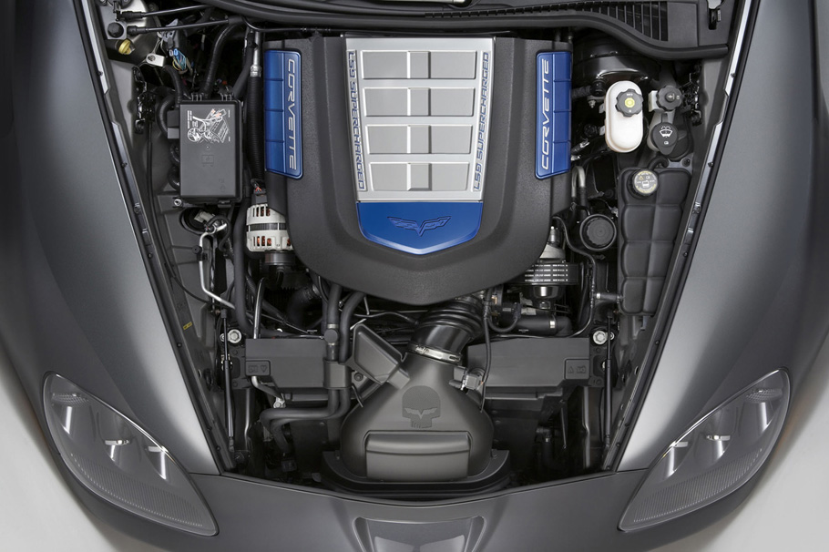 Beauty cover: A special engine cover is attached to the top of the LS9. It surrounds the intercooler, which is visible through a hood window. The intercooler has the legend “LS9 SUPERCHARGED” embossed on the left and right sides, and the engine beauty cover features the Corvette crossed flags logo debossed at the front.