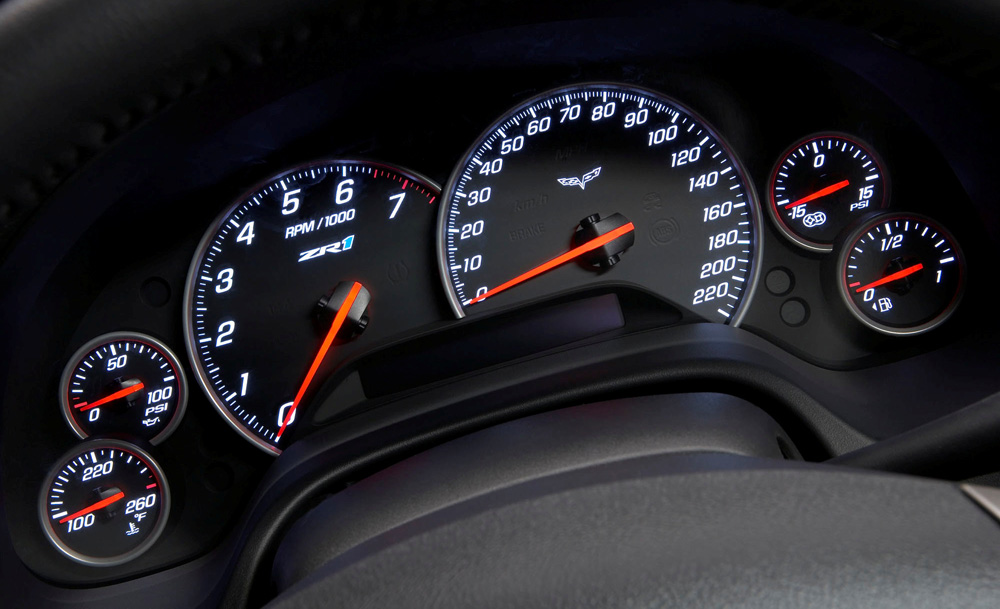 Specific gauge cluster with “ZR1” logo on the tachometer and a 220-mph (370 km/h) readout on the speedometer