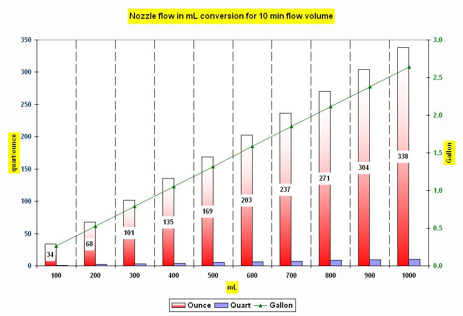 Conversion of fluids in mL to ounces, quart and gallon from 1 minute to 60 mountes ON time