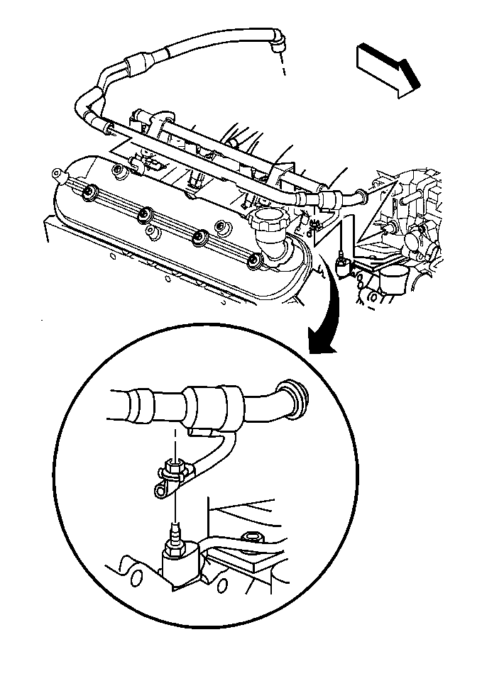 The LS7 engine utilizes an integral positive crankcase ventilation (PCV) system which is located in the engine valley cover beneath the intake manifold. The engine valley cover contains composite oil separating baffles and PCV plumbing. Filtered fresh air is routed from up stream of the throttle plate to the engine oil tank where it mixes with crankcase gasses and is passed to both engine rocker arm covers.