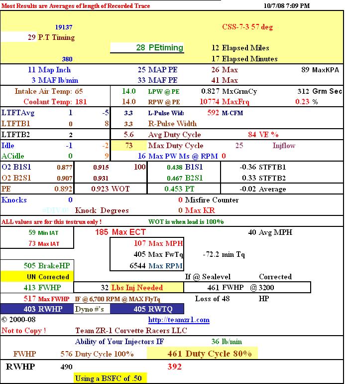 Also the injector maximum duty cycle was only 73% and in this testrun flywheel horsepower was 461 yet the math shows for a 36 lb injector that would have been at the same HP thus data shows that the maximum injector needed in this run was 32 lb/hr.