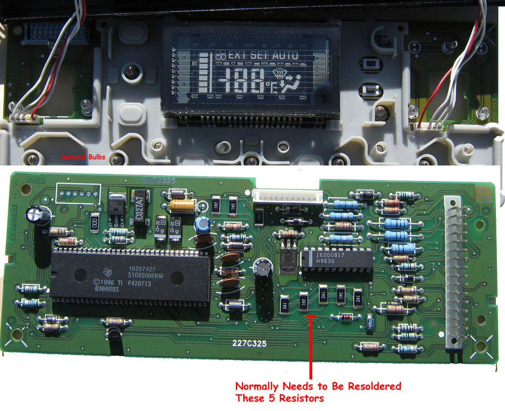 In most cases when the HVAC screen is dim or goes blank there is 5 surface mount resisters that need to be re-soldered shown below.