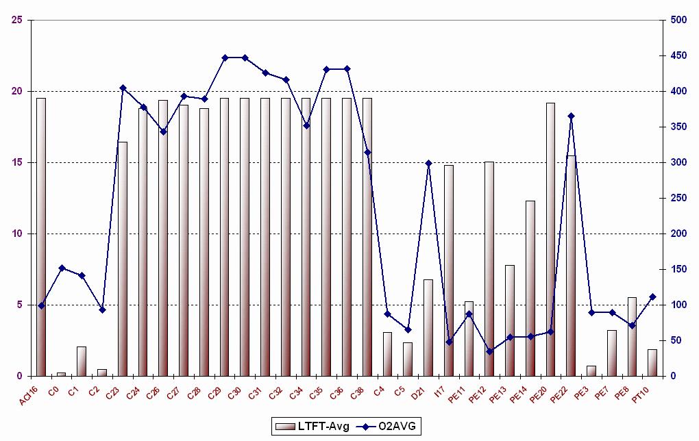Average part throttle fuel trims 19% lean yet very little engine knock yet lots of misfires. Maximum fuel injector duty cyle at 174% ! Front 02 sensor reporting less then 300 mVolt average while rear 02 staying around 960 mVolt. PCM was tripping high voltage P0103 DTC and P0171 lean DTC.