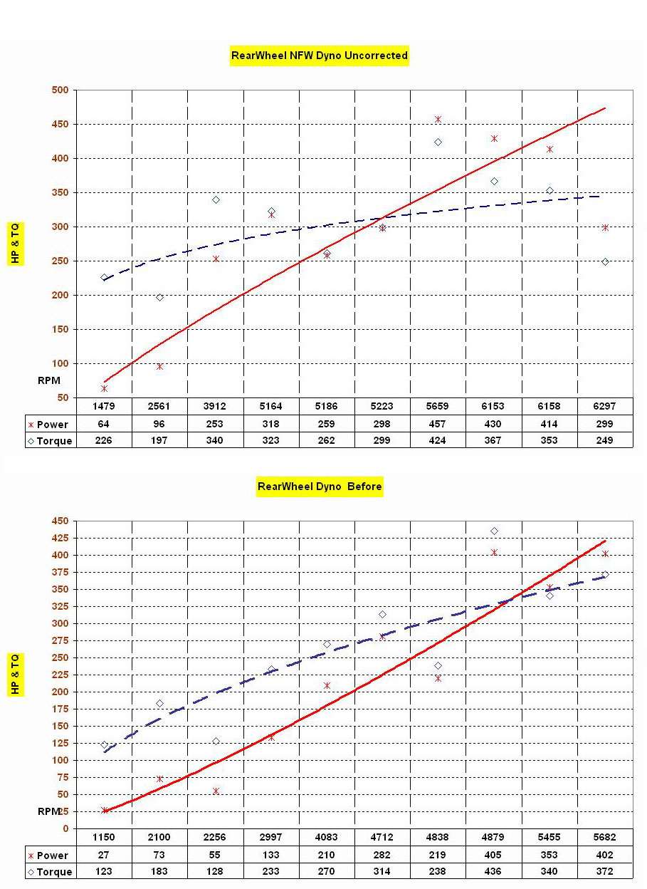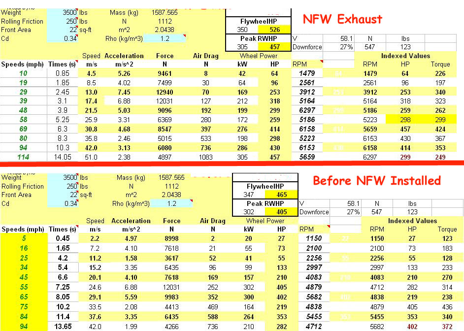 Here is results of before the NFW exhaust was installed and then with it on. This is with the full length design with the tailpipes.