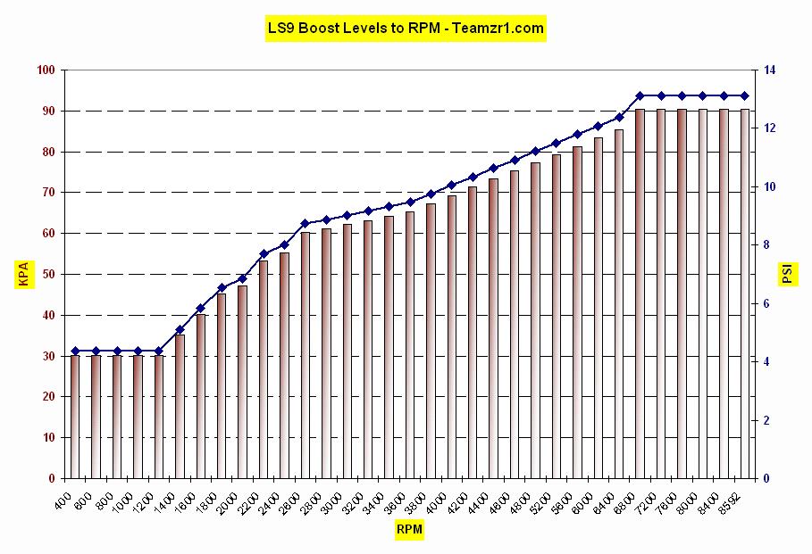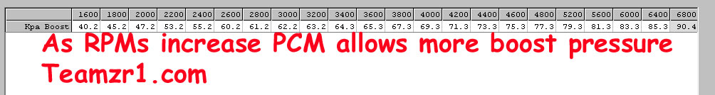 As engine RPMs increase the PCM allows more boost pressure. Stock is 13 PSI of boost maximum Doing the math in Kpa and PSI maps out to engine RPMs as below
