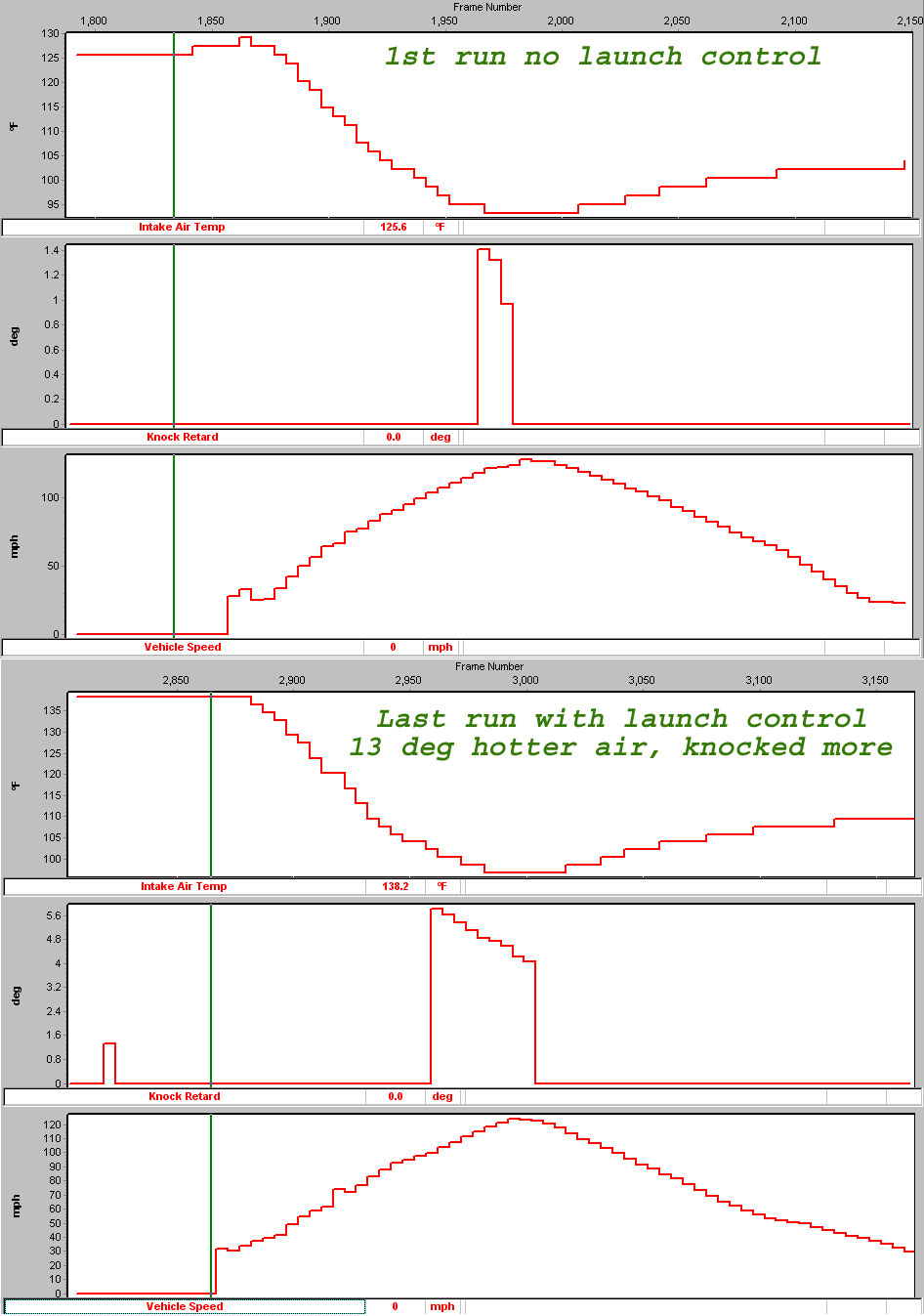 NOTE: as seen the launch control run was done last and by then the engine/engine bay had heat soaked and launch was done the intake air was up over 130 degrees causing knock which PCM pulled WOT timing.