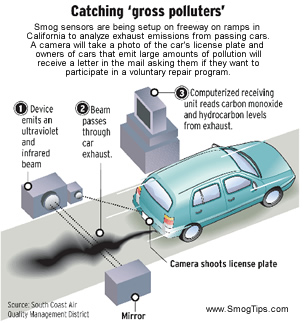 Remote smog sensors are appearing along California roadsides to measure emissions from cars as they drive by. The entire process takes about three seconds. Roadside smog test and emission test checkpoints are appearing all over the State of California.