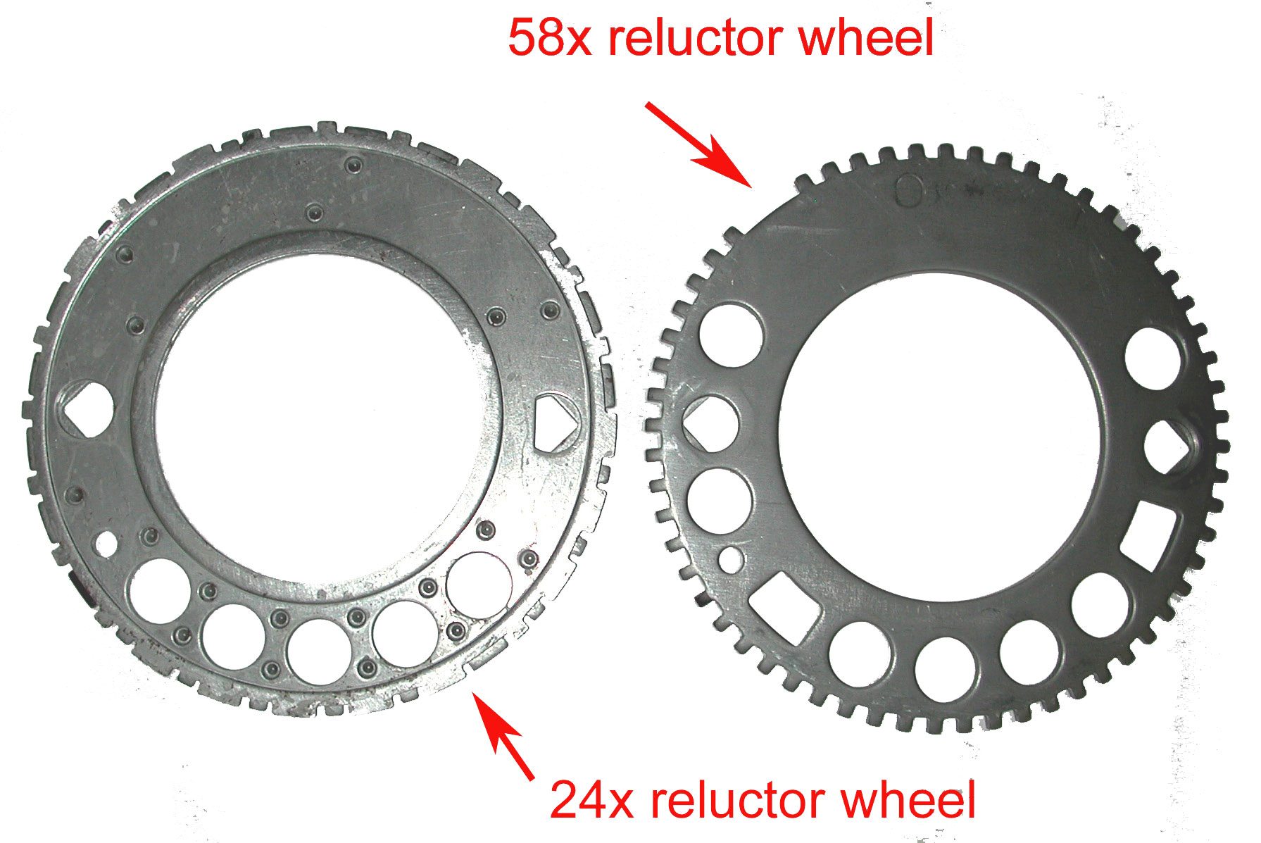Right image - 58X crankshaft reluctor wheel found on later Gen IV V8 engines (2006-2007 Corvette LS2, 2006-2009 Corvette LS7, 2008-2009 Corvette LS3 etc.)
