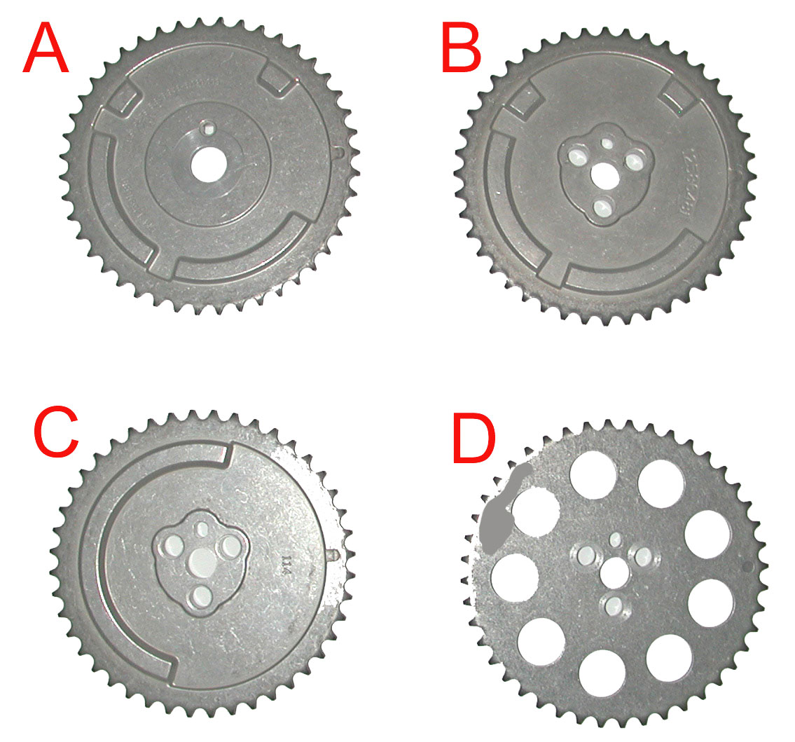 Camshaft timing gears: A - Single bolt 4X camshaft gear from a 2007-2009 LS2 or LS3 engine B - Three bolt 4X camshaft gear from a 2006 LS2 Corvette or from a 2006-2009 LS7 Corvette engine C - Three bolt 1X camshaft gear from a 2005 LS2 Corvette or a 2005-2006 LS2 GTO/SSR/Trailblazer engine D - Three bolt camshaft gear from a 1997-2004 LS1, LS6 or other Gen III V8 engines. No reluctor teeth are on the timing chain gear since the camshaft position sensor is at the back of the block and senses the camshaft speed from the reluctor machined into the back of the camshaft itself.