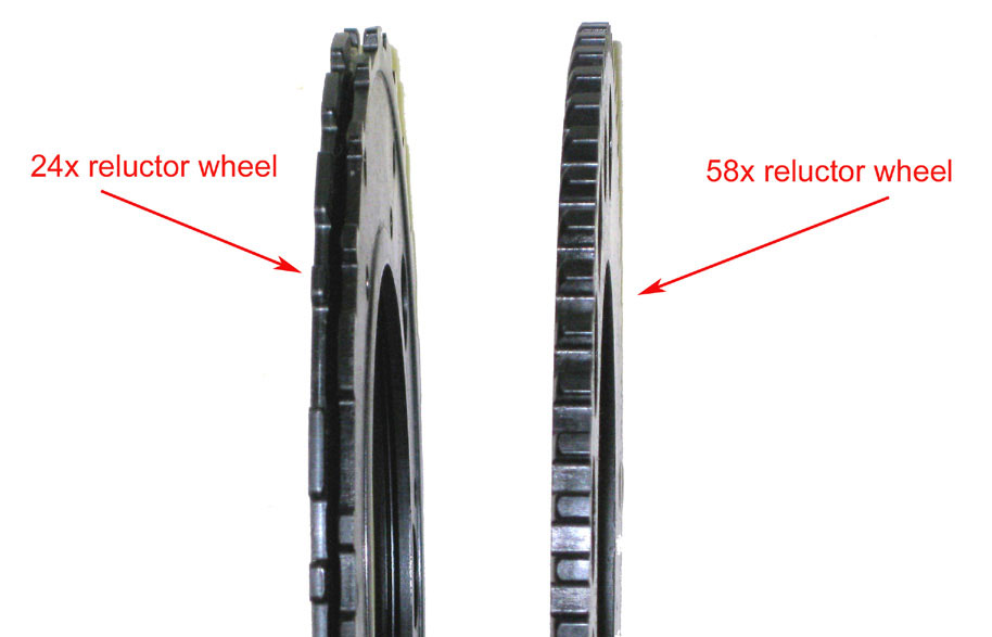 Right image - 58X crankshaft reluctor wheel found on later Gen IV V8 engines (2006-2007 Corvette LS2, 2006-2009 Corvette LS7, 2008-2009 Corvette LS3 etc.)