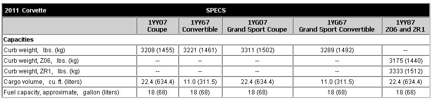 Option Code Description **6 Seat trim, two-tone modified seats with perforated leather seating surfaces 0B1 Seat trim, crossed flag embroidery on headrest 17A Light Silver Metallic fender stripe 40A Pearl White fender stripe 5V4 LPO, GCA Ultimate Package 5V5 LPO, Full-Width Spoiler Kit 75A Victory Red fender stripe 90A Cyber Gray fender stripe AAB Memory Package AG2 Seat adjuster, front passenger 6-way power AJ7 Air bags, frontal and side-impact, driver and front passenger AJK Seat adjusters, power bolster and power lumbar AP9 Cargo net, in rear compartment area AQ9 Seats, Sport front bucket with perforated leather seating surfaces AQ9 Seats, Sport front bucket AR9 Seats, front bucket with leather seating surfaces C05 Convertible top, manual folding C2L Roof Package CC3 Roof panel, 1-piece transparent, removable CF7 Roof panel, 1-piece body-color, removable CFZ Z06 Carbon Fiber Package CJ2 Air conditioning, dual-zone automatic climate control CM7 Convertible top, power folding D30 Color Combination Override D42 Cargo net and luggage shade DD0 Mirrors, outside heated power-adjustable and driver-side auto-dimming, body-color DD8 Mirror, inside rearview auto-dimming ERI Battery Protection Package F55 Magnetic Selective Ride Control F55 Magnetic Selective Ride Control FE1 Suspension, 4-wheel independent FE4 Z06 Performance Package FE5 ZR1 Performance Package FE9 Emissions, Federal requirements GM8 Rear axle, 2.56 ratio GU2 Rear axle, 2.73 ratio GU6 Rear axle, 3.42 ratio H33 Cyber Gray Metallic headlamp color override H34 Blade Silver Metallic headlamp color override H35 Black headlamp color override J55 Brake rotors, cross-drilled KA1 Seats, heated driver and front passenger LS3 Engine, 6.2L V8 SFI LS7 Engine, 7.0L (427 ci) LS7 V8 SFI LS9 Engine, 6.2L supercharged V8 SFI MN6 Transmission, 6-speed manual MN6 Transmission, 6-speed manual MX0 Transmission, 6-speed paddle shift with automatic modes N37 Steering column, power telescopic with manual tilt NB8 Emissions override, California NB9 Emissions override, state-specific NC7 Emissions override, Federal NE1 Emissions, Connecticut, Maine, Maryland, Massachusetts, New Jersey, New Mexico, New York, Oregon, Pennsylvania, Rhode Island, Vermont and Washington state requirements NK4 Steering wheel, 3-spoke leather-wrapped NPP Exhaust, dual-mode, performance PYC Wheels, Grand Sport Silver painted aluminum, 18" x 9.5" (45.7 cm x 24.1 cm) front and 19" x 12" (48.3 cm x 30.48 cm) rear PYD Wheels, Grand Sport Competition Gray-painted aluminum, 18" x 9.5" (45.7 cm x 24.1 cm) front and 19" x 12" (48.3 cm x 30.48 cm) rear PYE Wheels, Grand Sport chrome aluminum, 18" x 9.5" (45.7 cm x 24.1 cm) front and 19" x 12" (48.3 cm x 30.48 cm) rear Q10 Wheels, spider design, Z06 Silver-painted aluminum, 18" x 9.5" (45.7 cm x 24.1 cm) front and 19" x 12" (48.3 cm x 30.48 cm) rear Q44 Wheels, spider design, Z06 Competition Gray-painted aluminum, 18" x 9.5" (45.7 cm x 24.1 cm) front and 19" x 12" (48.3 cm x 30.48 cm) rear Q6A Wheels, ZR1 sterling silver painted aluminum, 19" x 10" (48.3 cm x 25.4 cm) front and 20" x 12" (50.8 cm x 30.48 cm) rear Q6B Wheels, ZR1 chrome aluminum, 19" x 10" (48.3 cm x 25.4 cm) front and 20" x 12" (50.8 cm x 30.48 cm) rear Q6J Wheels, ZR1 Competition Gray aluminum, 19" x 10" (48.3 cm x 25.4 cm) front and 20" x 12" (50.8 cm x 30.48 cm) rear Q8A Wheels, spider design, Z06 chrome aluminum, 18" x 9.5" (45.7 cm x 24.1 cm) front and 19" x 12" (48.3 cm x 30.48 cm) rear QG6 Wheels, 5-spoke, Silver-painted aluminum, 18" x 8.5" (45.7 cm x 21.6 cm), front and 19" x 10.0 " (48.3 cm x 25.4 cm), rear QX1 Wheels, 5-spoke, Competition Gray-painted aluminum, 18" x 8.5" (45.7 cm x 21.6 cm) front and 19" x 10.0 " (48.3 cm x 25.4 cm) rear QX3 Wheels, 5-spoke, chrome aluminum, 18" x 8.5" (45.7 cm x 21.6 cm) front and 19" x 10.0 " (48.3 cm x 25.4 cm) rear R8C Corvette Museum Delivery R8E Gas guzzler tax R8G OnStar 1 Additional Year of OnStar Safe and Sound Service R8P OnStar 30 Additional Months of OnStar Safe and Sound Service R8W OnStar 2 Additional Years of OnStar Safe and Sound Service R8Y OnStar 1 Additional Year of OnStar Directions and Connections Service R8Z OnStar 2 Additional Years of OnStar Directions and Connections Service RFA OnStar Business Vehicle Manager Service RQ1 Wheels, 5-spoke, machined-face aluminum, 18" x 8.5" (45.7 cm x 21.6 cm) front and 19" x 10.0 " (48.3 cm x 25.4 cm) rear U2K XM Radio U3U Audio system with navigation, AM/FM stereo with CD player, MP3 playback and DVD-based touch-screen navigation U52 Instrumentation, electronic analog U65 Audio system feature, Bose premium 7-speaker system U66 Audio system feature, 7-speaker system UE1 OnStar, 6 months of Directions and Connections plan UG1 Universal Home Remote UJM Tire Pressure Monitor System UK3 Steering wheel controls, mounted audio controls UPF Bluetooth for phone, personal cell phone connectivity to vehicle audio system and HMI (Human Machine Interface) US8 Audio system, AM/FM stereo with CD player and MP3 playback US9 Audio system, AM/FM stereo with 6-disc in-dash CD changer and MP3 playback UV6 Head-Up Display VDA LPO, Mesh Package VDN LPO, Indoor vehicle cover VEB LPO, Pedal cover set VEU LPO, 15-spoke polished 18" (45.7 cm) front and 19" (48.3 cm) rear wheels VFS LPO, 7-spoke chrome 18" (45.7 cm) front and 19" (48.3 cm) rear wheels VJ5 LPO, Outdoor vehicle cover VK3 License plate bracket, front VLN LPO, Windscreen VPK LPO, GCA Exterior Package VPL LPO, GCA Ultimate Package VRX LPO, Grand Sport indoor vehicle cover VRY LPO, Grand Sport outdoor vehicle cover VRZ LPO, ZR1 indoor vehicle cover VUC LPO, Red stitch shift knob and boot VUF LPO, Yellow stitch shift knob and boot VUG LPO, Blue stitch shift knob and boot XBH Tires, front P245/40ZR18 Eagle F1 XFA Tires, front P275/35ZR18 Eagle F1 Supercar XFA Tires, front P275/35ZR18 Eagle F1 Supercar GEN2 XFG Tires, front P285/30ZR19 Michelin PS2 YF5 Emissions, California state requirements YFJ Tires, rear P325/30ZR19 Eagle F1 Superca