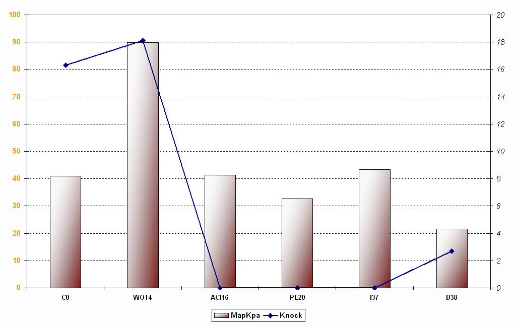 You see the fuel injectors are maxing out around 86% duty cycle. Water temps peaking 220 deg and Intake Air Temp (IAT) over 180 degrees. This with E10 gas induces engine knock during WOT with just 18 degrees of timing