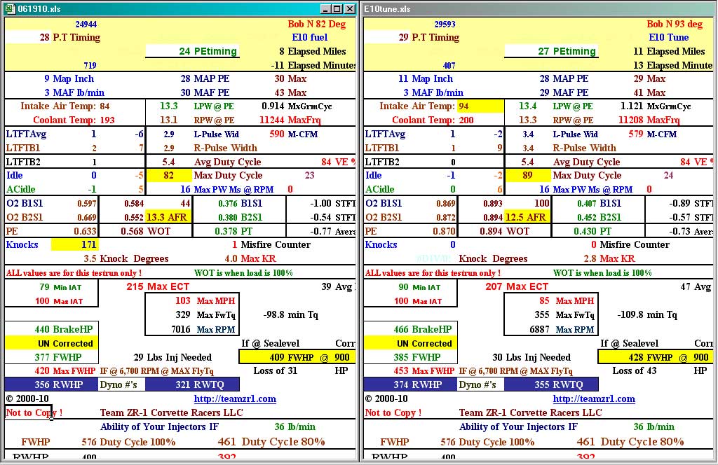 In this case a 2001 C5 Z06 located in Sac Ca in 90 degree weather. Bob the owner had issues with lack of performance and lot more knock since feds mandated E10 gas be used E10 use on left of results and E10 tune on right