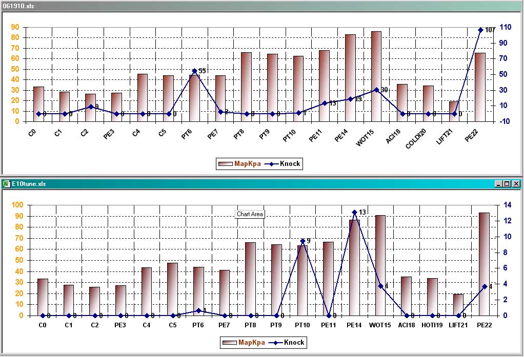 Notice in lower graphs ( E10 top, Tuned for E10 bottom) how much knock E10 was causing and how much we reduced via the tune.