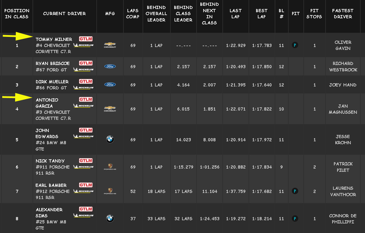 On the restart, Garcia spun the wheels in the #3 Corvette and fell to eighth, but teammate Tommy Milner had the #4 Corvette up to third, behind Sims and Earl Bamber (replacing Vanthoor in the #912 Porsche) and ahead of the #66 Ford, now piloted by Dirk Muller.