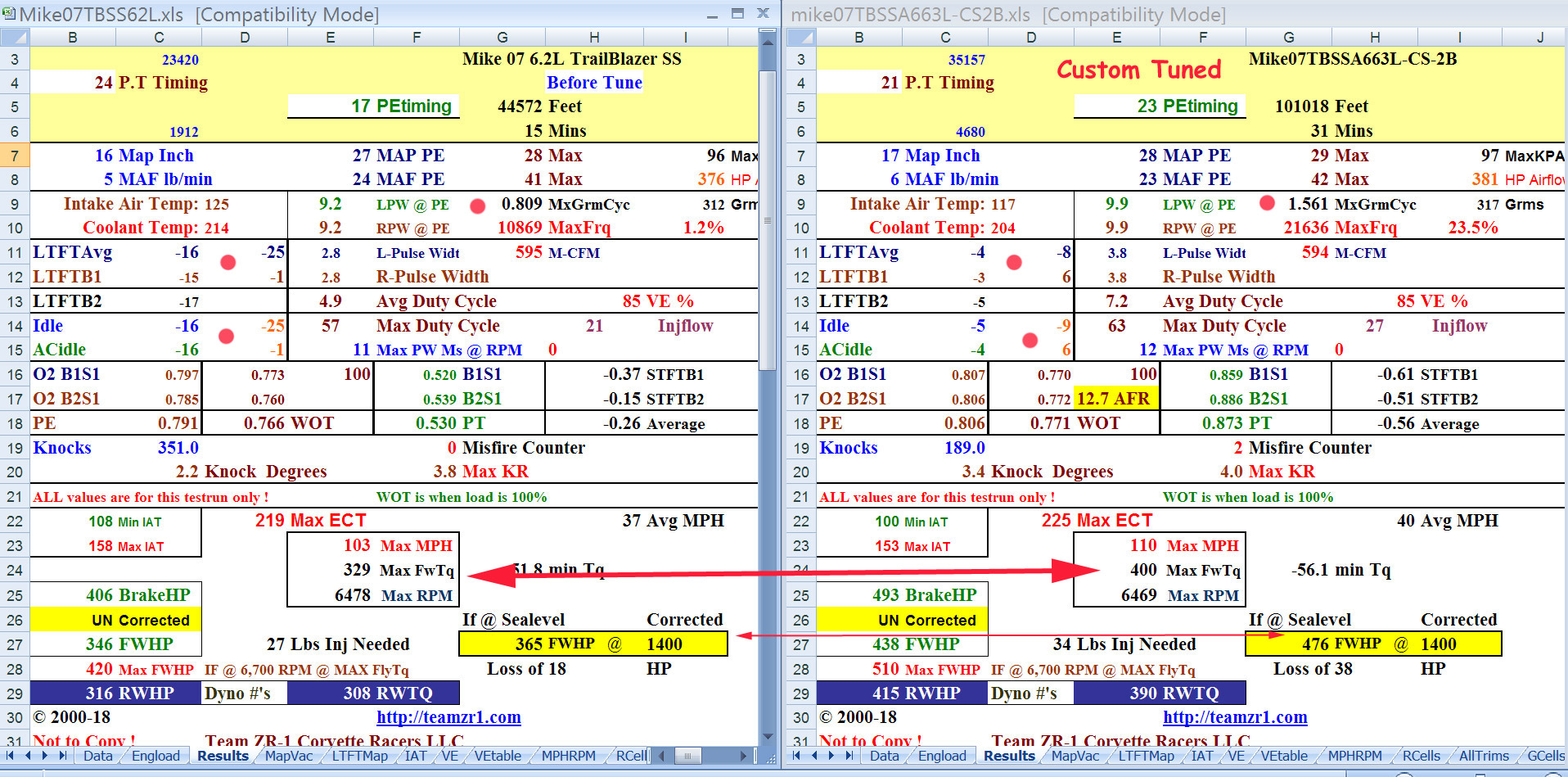 Once the shop did several testruns from 3 different levels of tuning we solved all issues and as seen the flywheel HP of 365 and Tq of 329 ft/lbs before our tune increased to 476 HP and 400 ft/lbs ( results on right side of image below) and that was in 90 degree weather and not a very hard testrun so in cooler weather and harder testrun those numbers will get even better