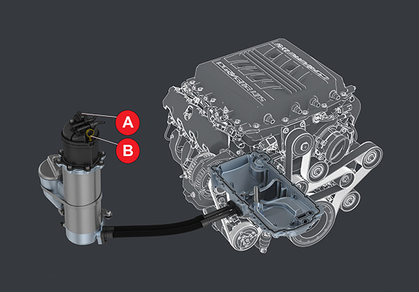 The dry sump engine oil tank fill (Fig. 32 A & B) are located on the passenger-side of the engine compartment