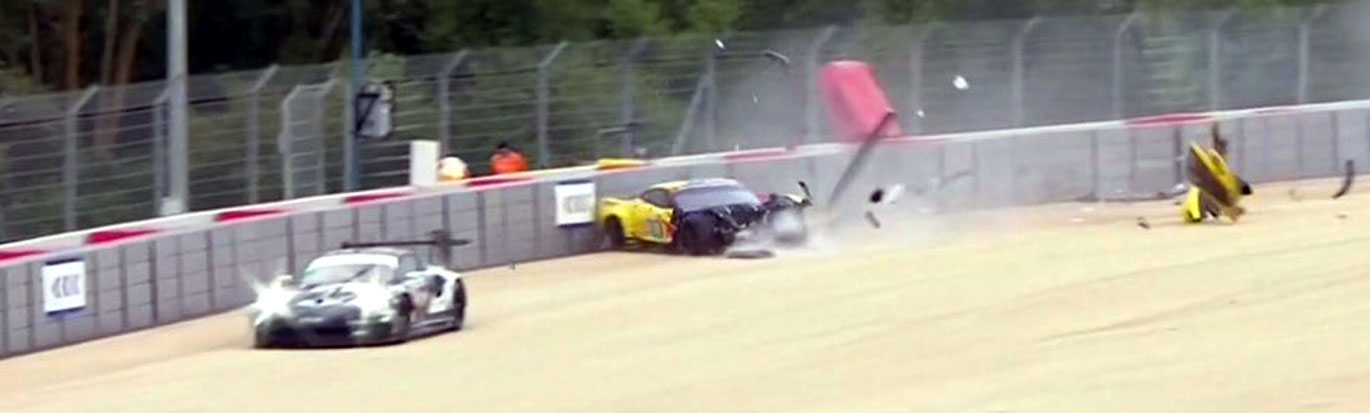 The infamous set of sweeping bends have claimed their first victim of the race, the No. 64 Corvette Racing C7.R of Marcel Fassler, which was running just outside the top five in Pro.
