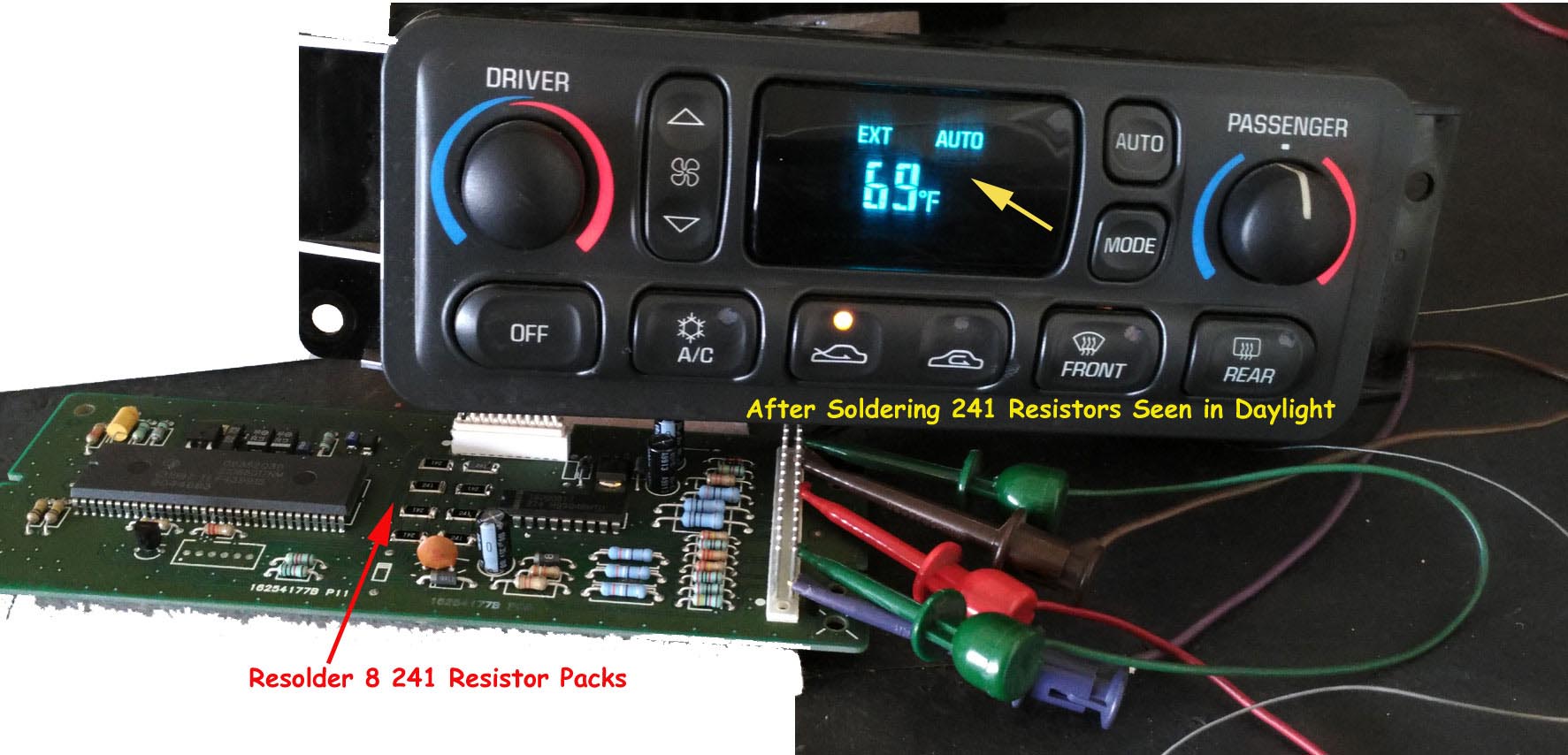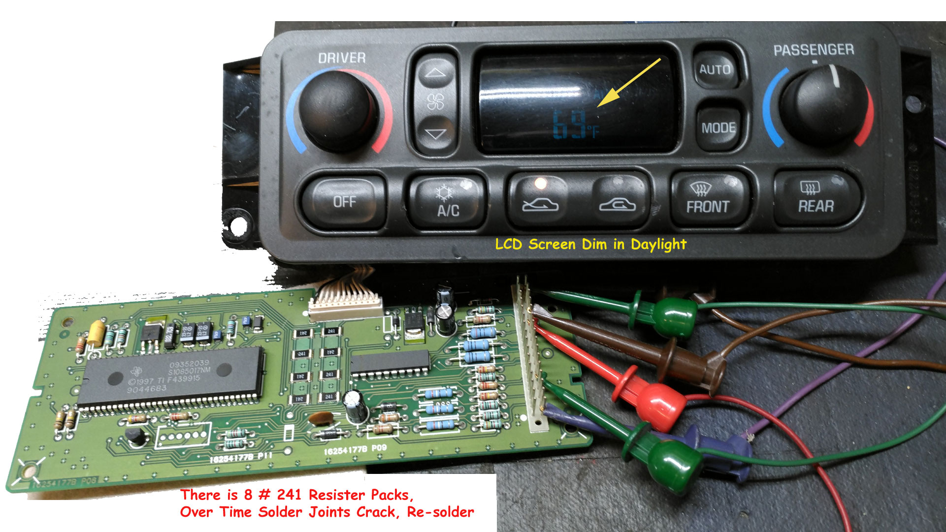 Take the HVAC unit out of the console, there is only 1 small mounting screen at each end. Disconnect the wiring harness from the unit Remove 4 small screws on the back side to crack open the rear and front cases. Lift up the rear daughter board out of that back case Turn over and look for eight resister packs labeled 241 Use a low wattage soldering iron with thin solder Re-solder both ends of each of the 8 resister packs, do not over heat them Best is re-solder just one end of each and then let them cool a few minutes and then re solder the other ends So that is 16 solder joint ends While unit is open lift the front daughter board by removing 4 small screws (1 per corner) and there is several LED as lights and the LCD screen and the lens for it and clean them Reverse the process in putting the HVAC unit back together and then reinstall back into the console Before installing center console turn Ign key to ACC and assure LCD now reads clearly