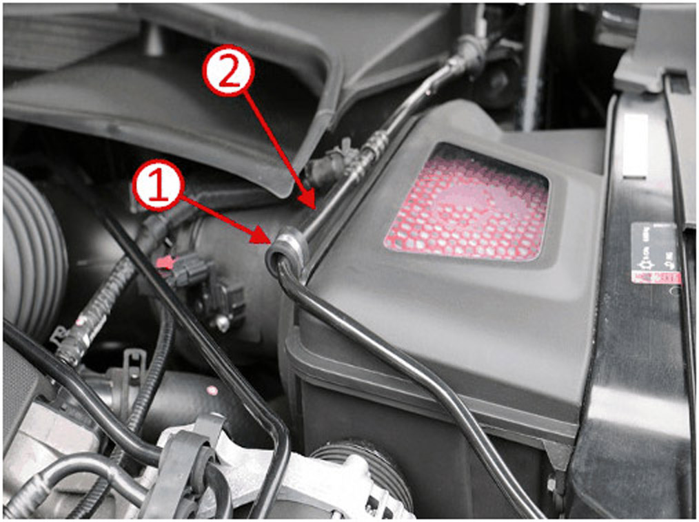 Remove and discard the retaining clip (1) that secures the coolant surge hose to the air box (2).
