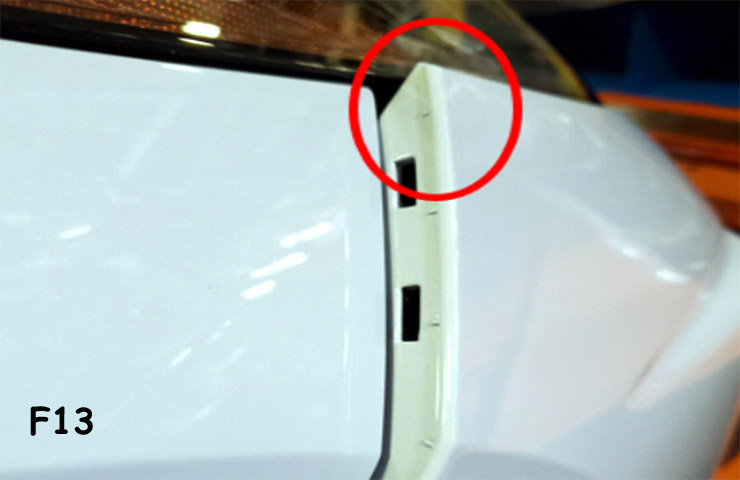 After adjusting the fender inboard, the headlamp lens (Fig. 12, #1) will be proud of the fender (Fig. 12, #2) and the fascia tip will install below the headlamp lens. (Fig. 13)