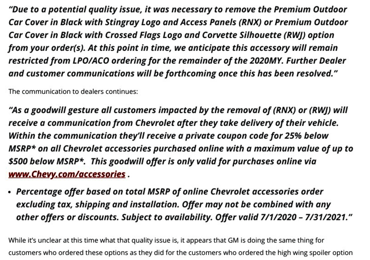 Below is a GM alert as it has been seen on multi C8s that using this cover is staining the clearcoat of paint and not coming off