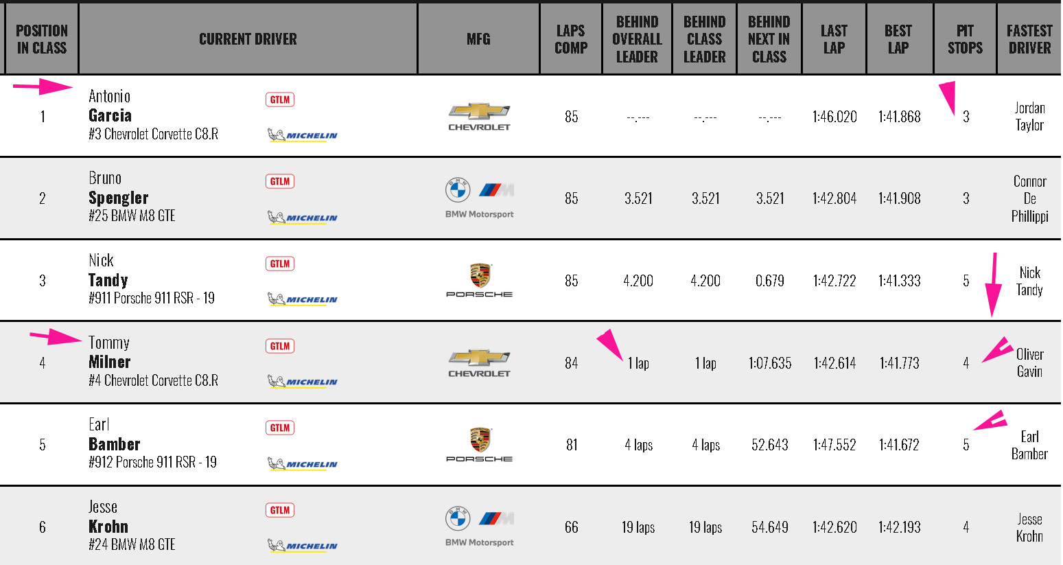 Meanwhile, Garcia had settled into second place but faced a 13-second gap to race leader Nick Tandy once the final GTLM pit cycle completed. The No. 3 Corvette got the break it needed with 17 minutes left when Tandy was forced to pit with a tire issue, sending Garcia to the lead.