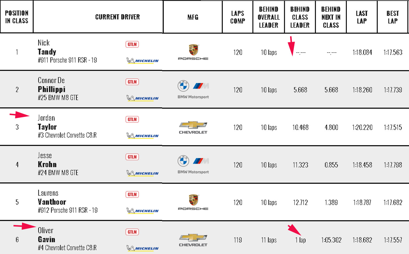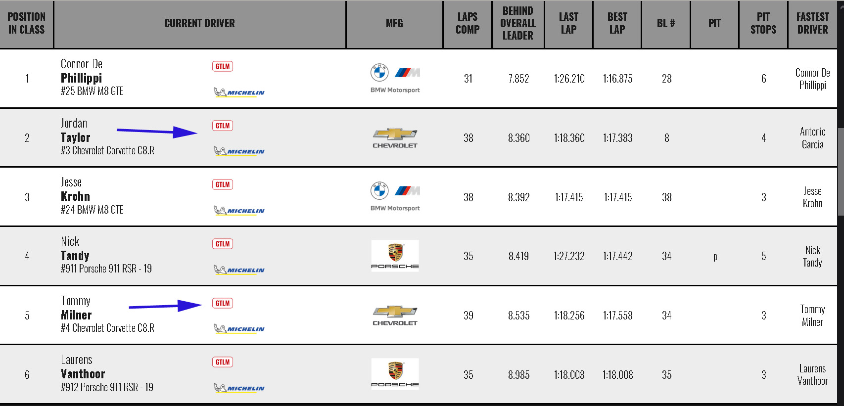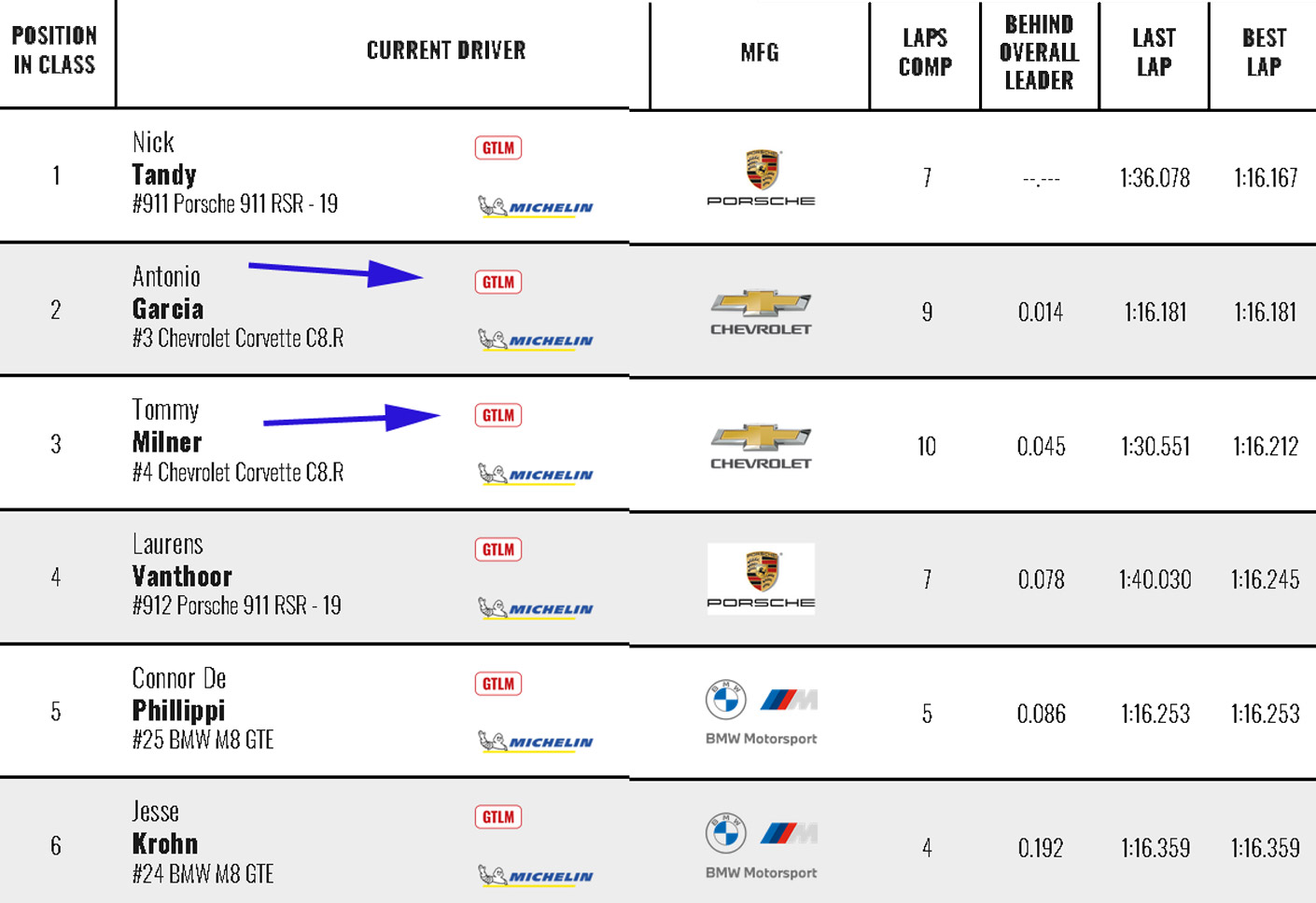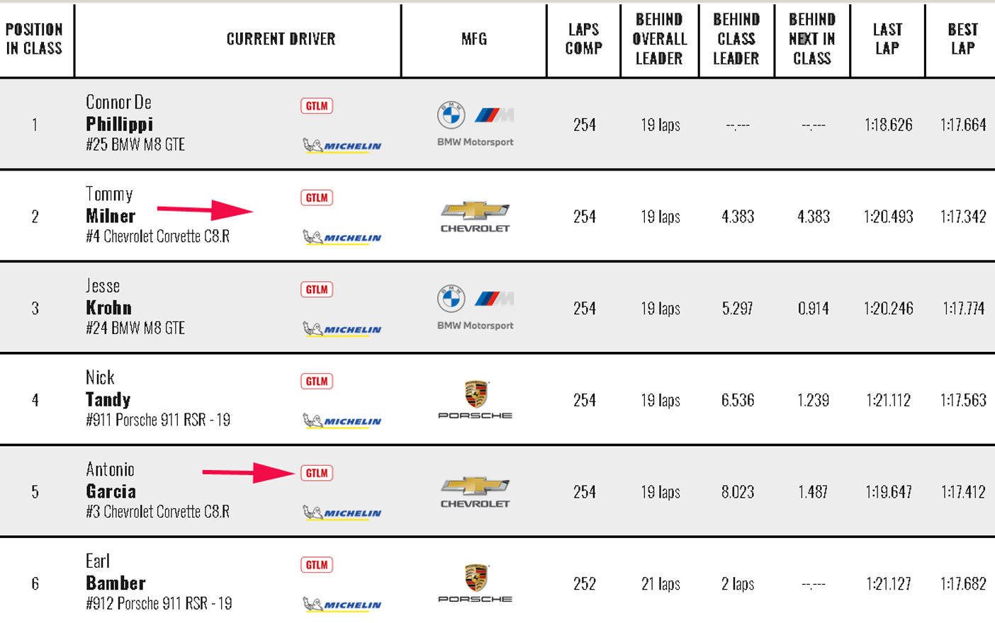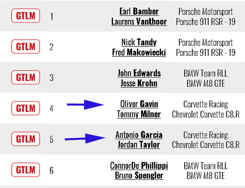 2020 WeatherTech SportsCar Championship – GTLM Standings Driver Standings 1. Antonio Garcia/Jordan Taylor – 165 2. Earl Bamber/Laurens Vanthoor – 146 3. Oliver Gavin/Tommy Milner – 145 4. Fred Makowiecki/Nick Tandy – 143 5. Jesse Krohn/John Edwards – 141