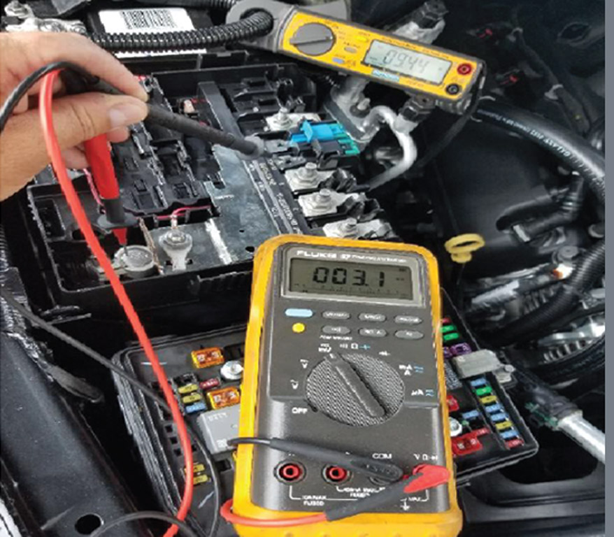 1. Road test the vehicle and operate all accessories to check for proper operation. 2. Connect a 50 Amp inductive amp clamp to the negative battery cable that can read down to 1 mA. 3. With the ignition Off, open all doors, hood, trunk/liftgate (to gain access to all components and fuse blocks) and manually close all latches and switches. 4. Lock the vehicle with the key fob and move the fob a safe distance so it doesn’t wake up the vehicle (distance depends on approach detection of the vehicle). 5. With all modules and components asleep, monitor the amperage. After approximately 10 minutes, amperage should drop to a stable value less than 20 mA. • If amperage is 40mA or higher, follow the fuse voltage drop test to identify the fuse(s) with an ongoing draw. • Measure all fuses and record voltage drop, fuse location, type and rating. 6. After all fuses are tested, identify the suspect circuits and calculate the amperage for each.