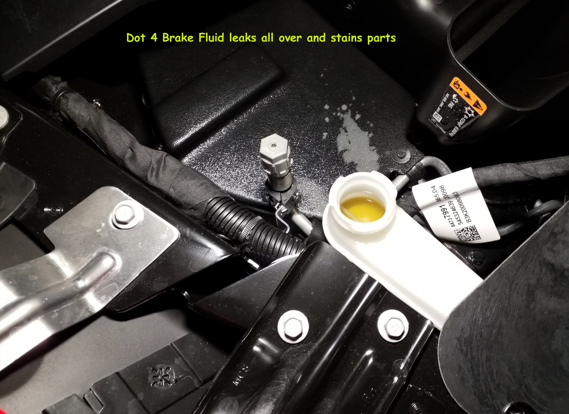 Brake fluid ruins lots of things including surfaces like plastic as caustic