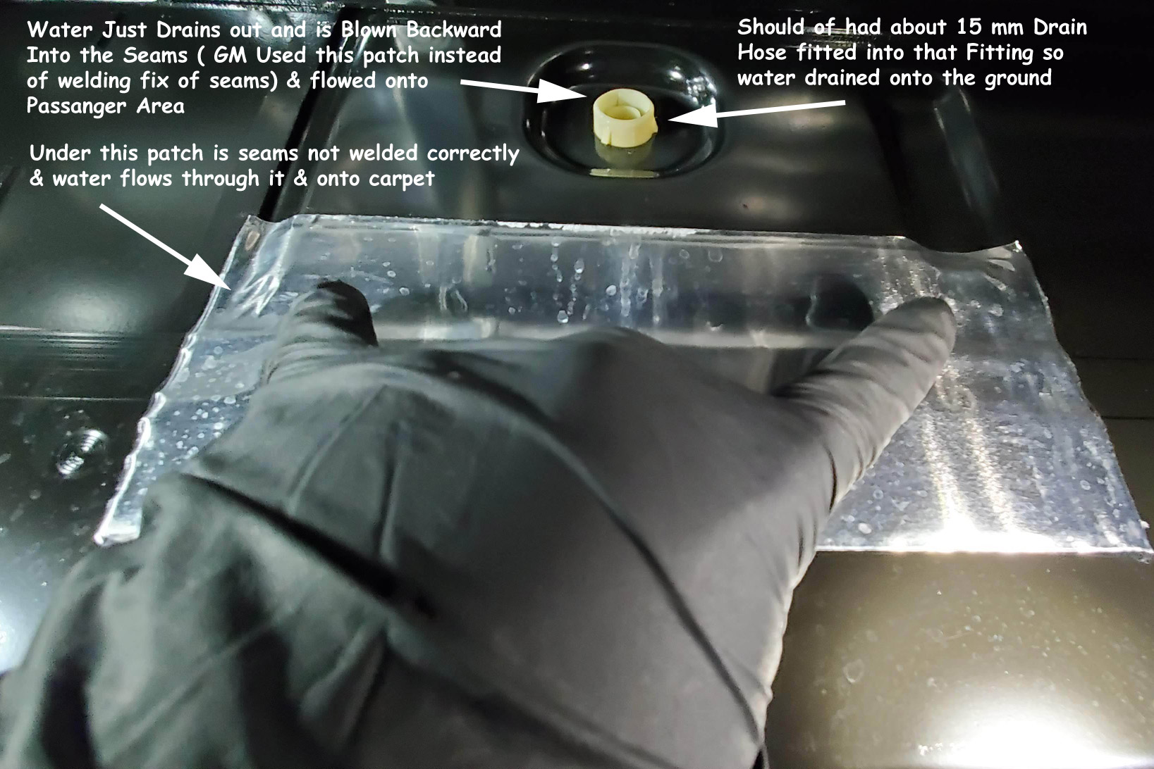 and is blown rearward to where the patch and seam is, water runs under the patch edge, through the seam and back up onto top of the passenger floor