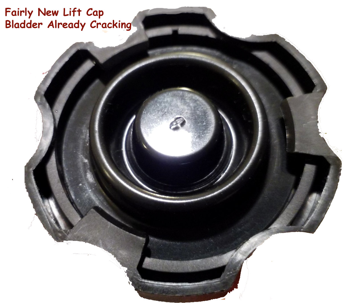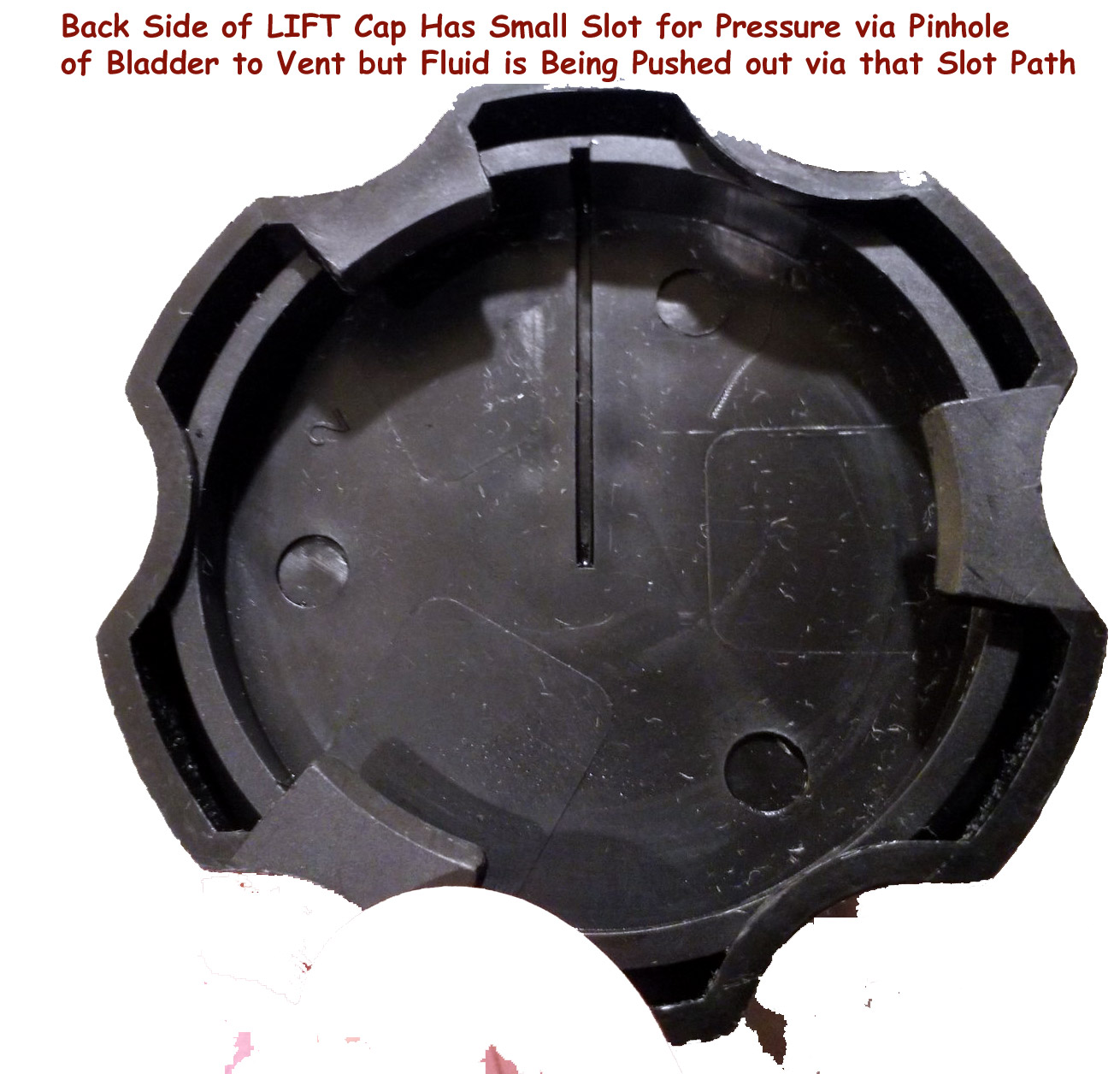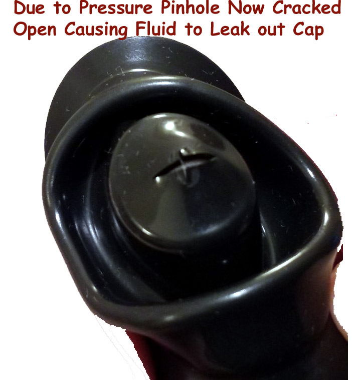 Bad design where the pressure is causing the pinhole in bladder under the fill cap to spreading crack allowing more volume of fluid