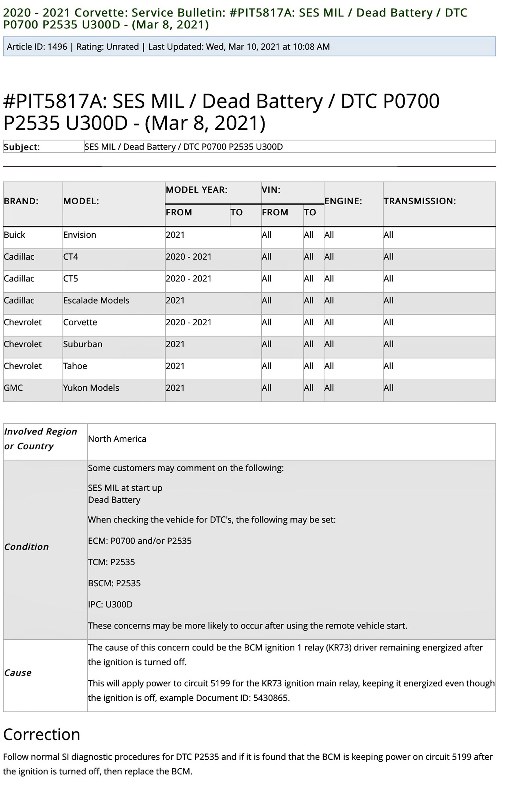 C8 Dead Battery TSB