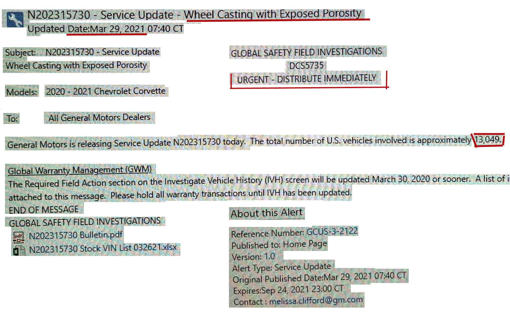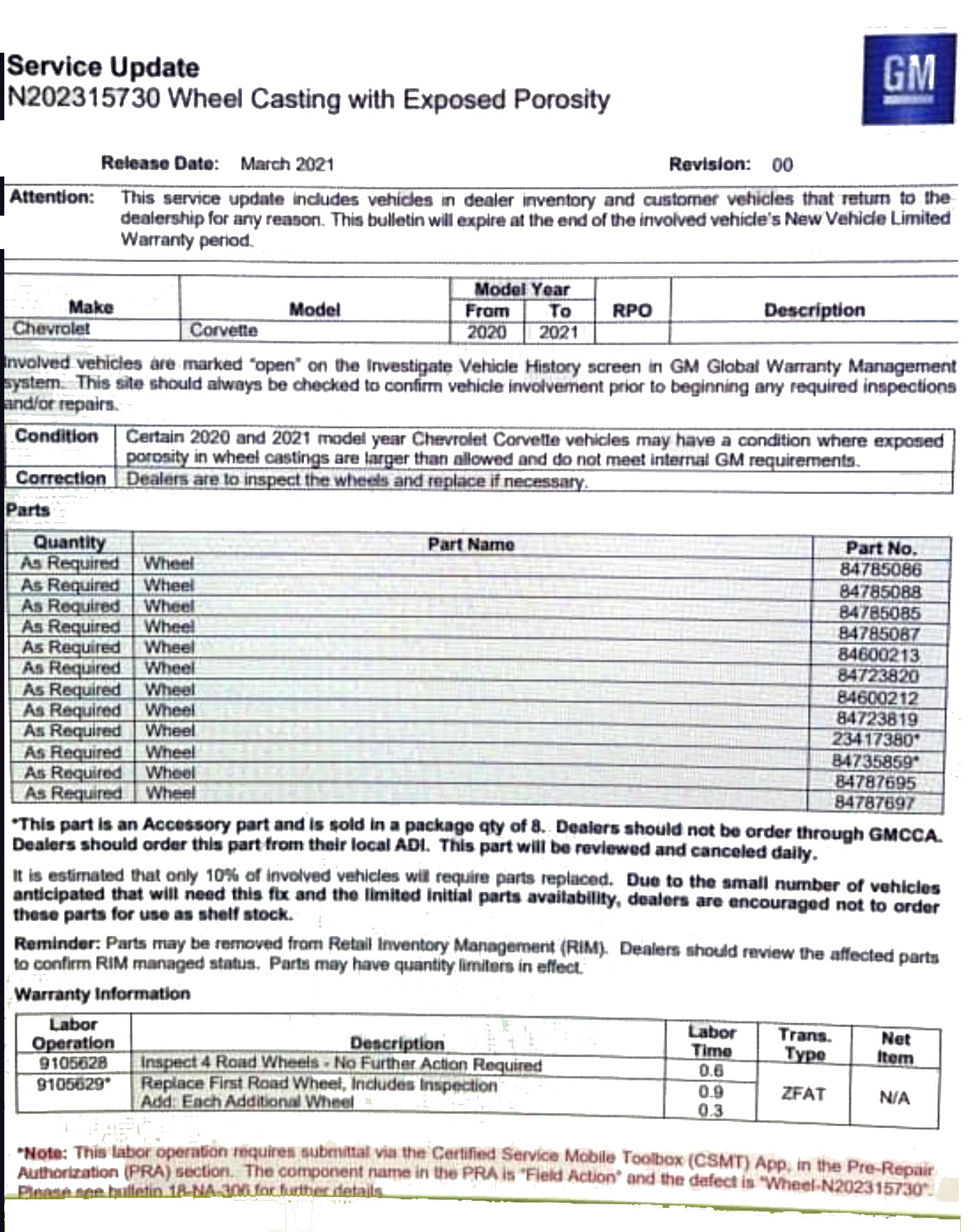 N202315730 Certain 2020 and 2021 Corvettes have a serious condition where exposed porosity in wheel castings are larger than allowed and do not meet internal GM requirements. Inspect and replace if necessary.