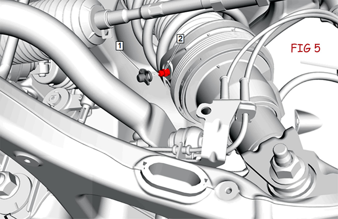 Next, raise and lower the front suspension system through 10 complete cycles. If the DTCs reset, perform the Front Hydraulic Suspension Bleed procedure and reevaluate the concern. Any time the front hydraulic suspension system is opened, it’s necessary to bleed the system at the front hydraulic suspension actuator bleeder valve (Fig. 5) using the CH-29532-A Pressure Brake Bleeder and CH-44894-A Brake Bleeder Adapter. Be sure to perform the bleed procedure before replacing any components.