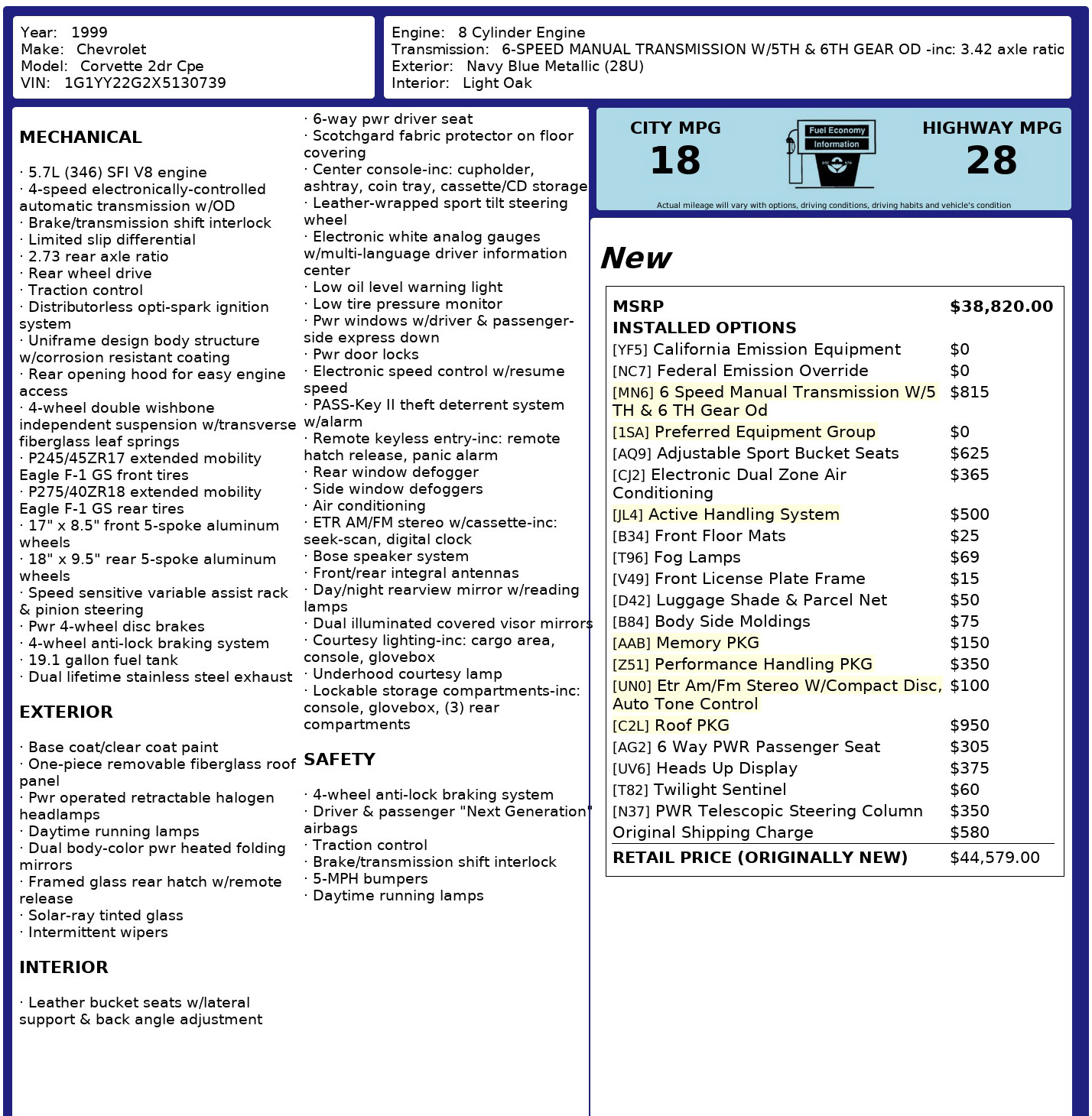 Window StickersHere is what it showed for a 1999 Corvette and would be worth the $7.99 even if you need a spare one located on your computer or print as many you need.