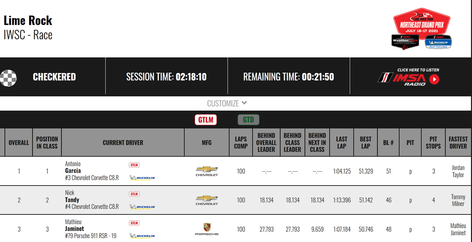 It would have tight; I don’t know if it would have been raining or not at the end, so it would have been hard to keep the lead. I’m really pleased for another Corvette 1-2. Looking at how Jordan and Tommy (Milner) drove, it seemed like very hard work with tire degradation, especially. I will definitely take it. It’s my first win at Lime Rock, so I’m happy with this.”