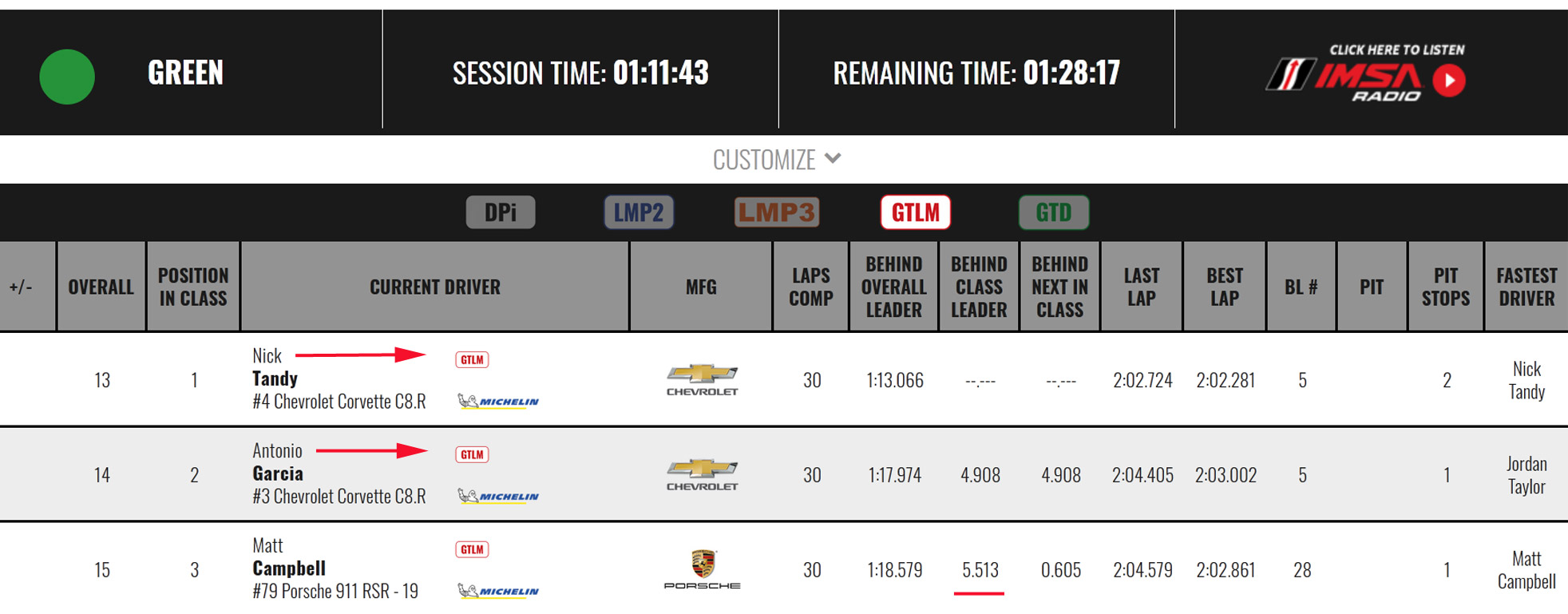 Meanwhile, Tandy remained in the No. 4 C8.R and took just enough fuel to top off the tank to move from third to first ahead of the restart at the 40-minute mark.