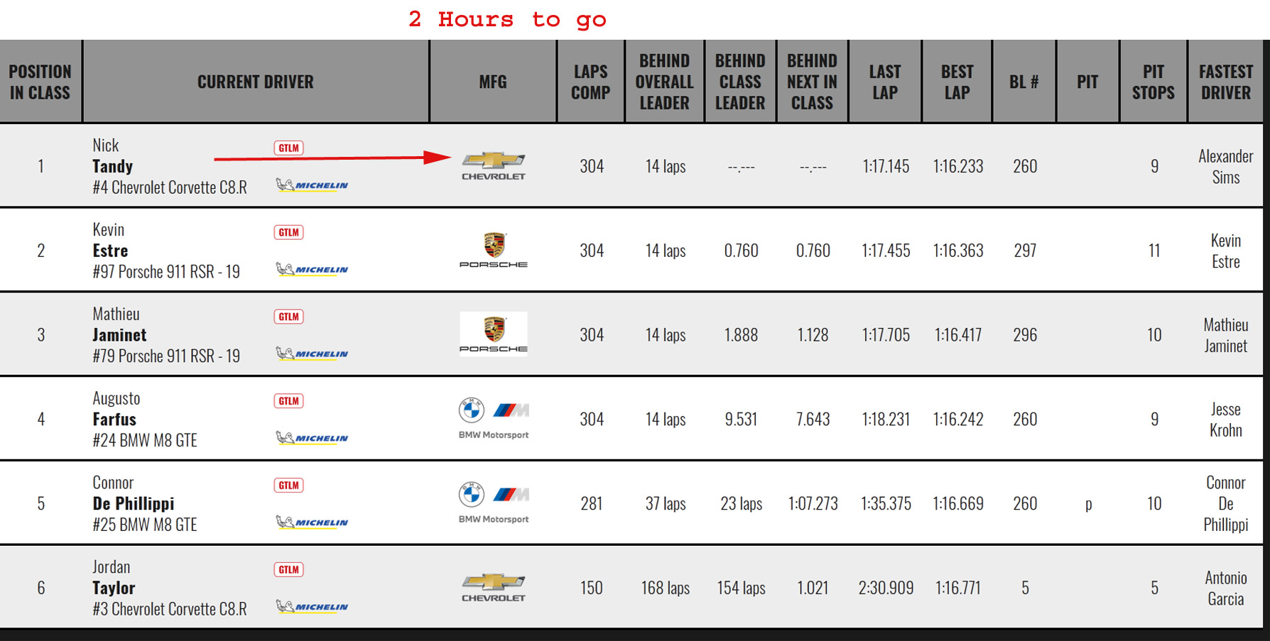 Previous race leader Estre drew clear of Tandy’s Corvette after the final round of pit stops that took place with approximately three-quarters of an hour to go. The two GT racing greats came to blows while fighting for the lead during the penultimate hour, in an episode that influenced the pit strategies for the final phase. Estre first got past Jaminet in the No. 79 WeatherTech Porsche before closing in on Tandy, who shared the No. 4 Corvette with Tommy Milner and Alexander Sims.