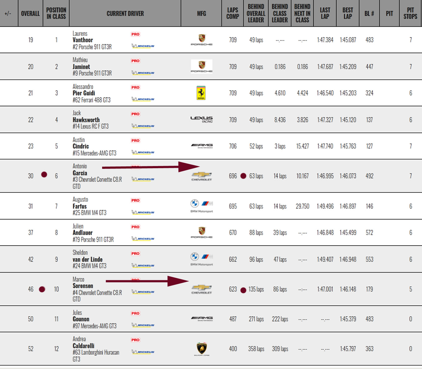 Their C8.R appeared to be the strongest of the Corvette Racing entries in the opening hours until rear contact after a restart with Sorensen at the wheel caused significant damage near the 8.5-hour mark.