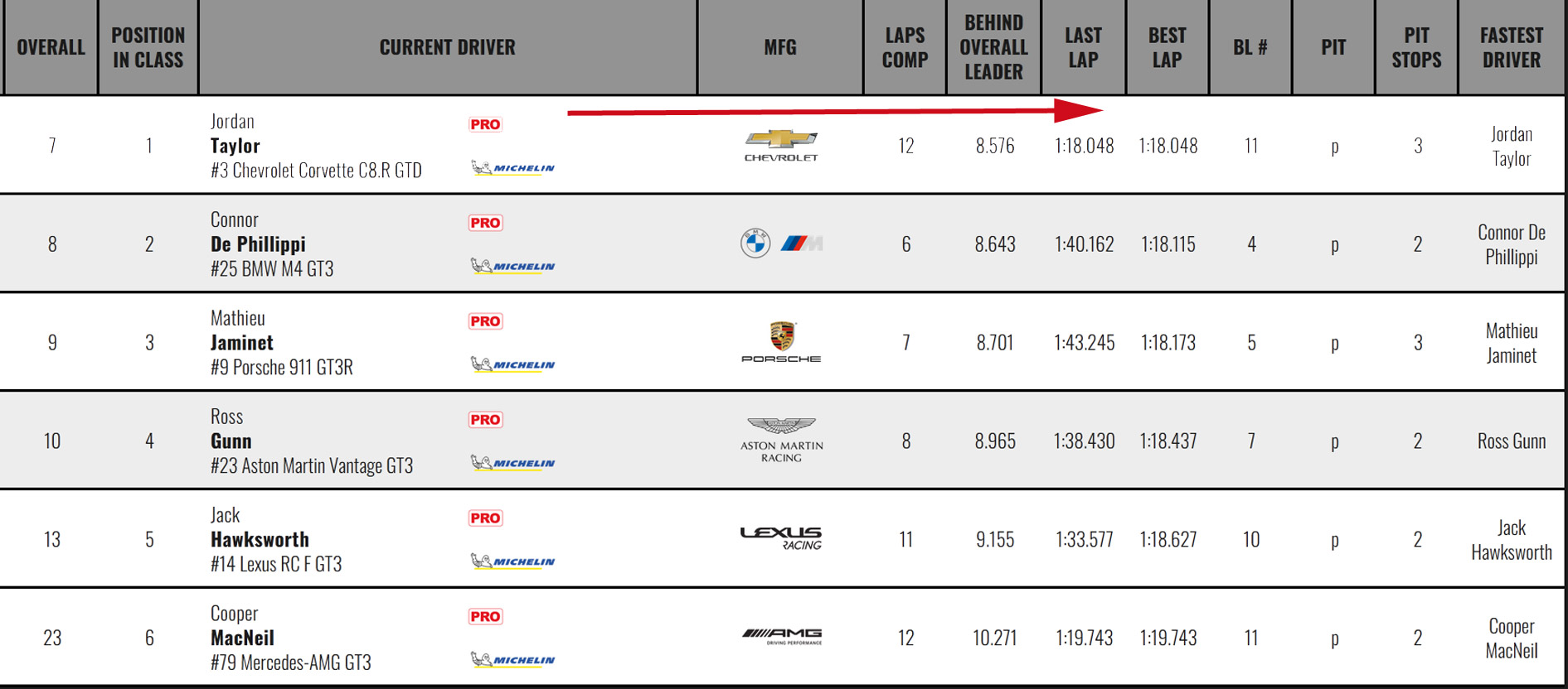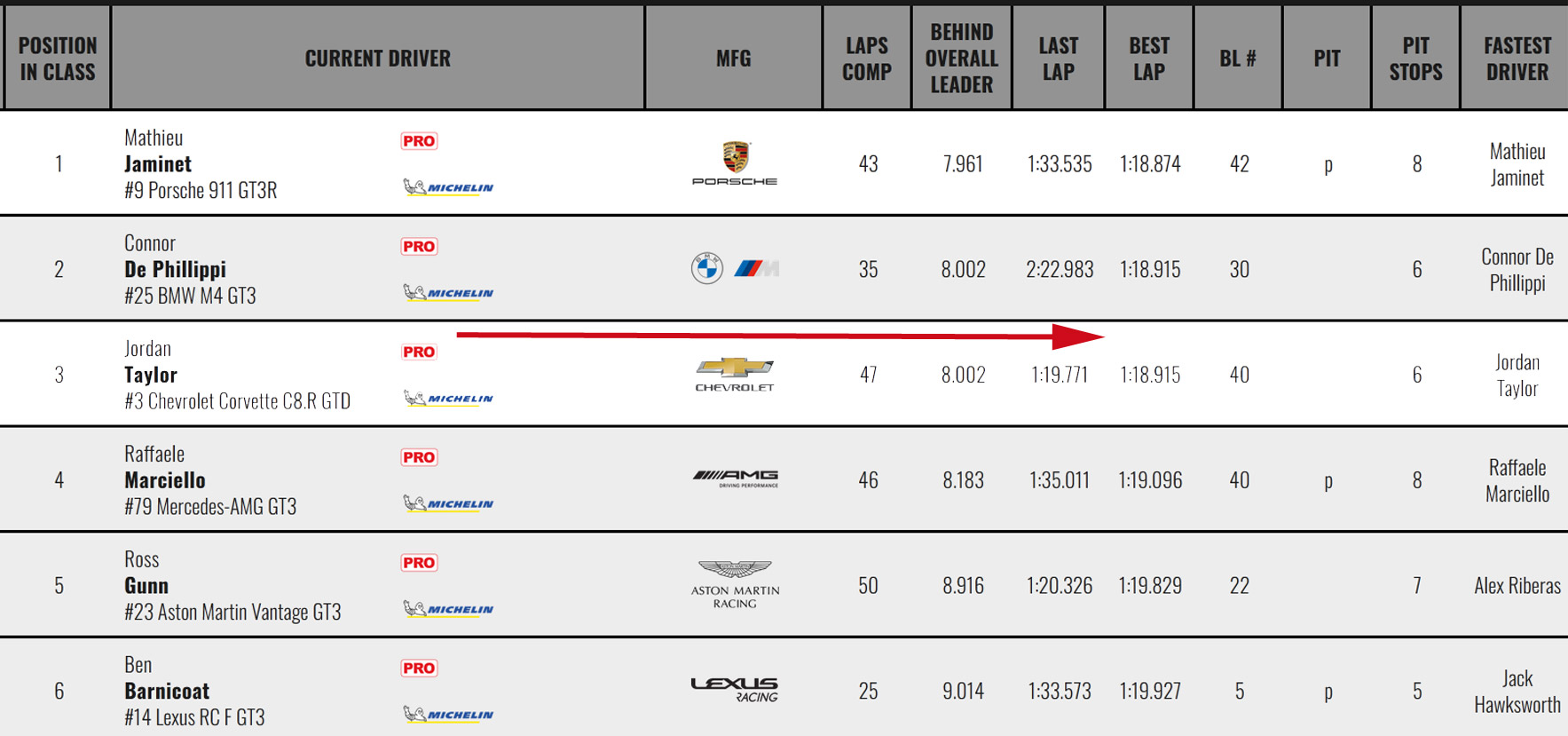 “We’ve seen in years past that if one of the Am guys (Silver- or Bronze-rated drivers in a GTD car) get out early by pitting at the beginning of their window before a yellow comes out, they can cycle to the front,” said Corvette Racing’s Jordan Taylor, a three-time series champion who shares the No. 3 Corvette C8.R GTD with Antonio Garcia in the GTD PRO class. “I think a GTD with an Am could win the race outright in the (GT) category. It’s so hard to pass now, especially with ABS (anti-lock braking system used in both GT classes). It’s going to feel like you’re flat out for pretty much all 100 minutes.”