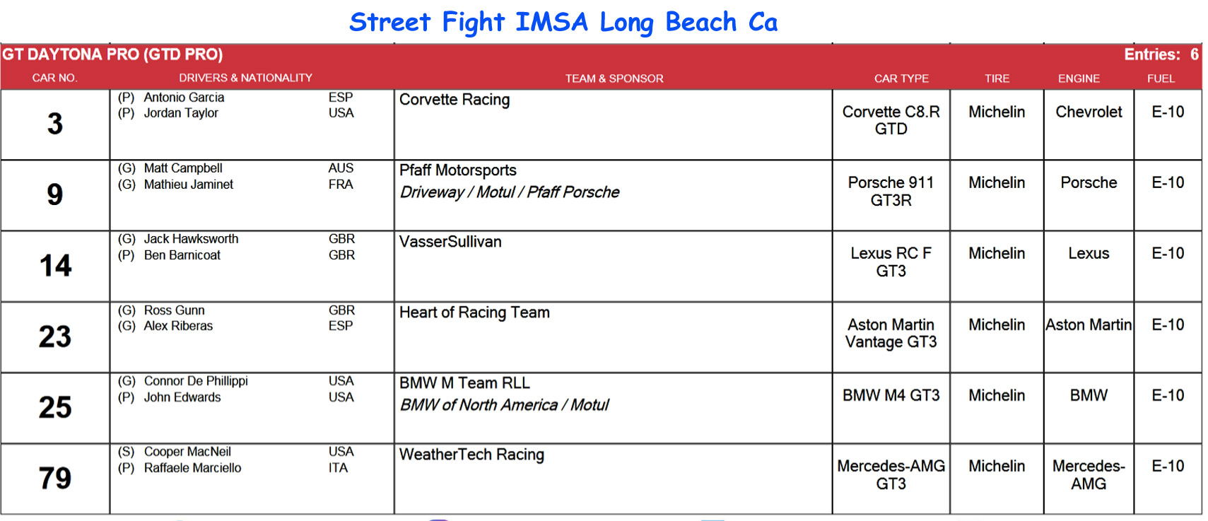 Grand Prix Of Long Beach April 8-10th, 2022 Track: Long Beach Street Circuit Race Duration: 1 hour 40 minutes Circuit Length: 1.968 miles Entry by Class: Daytona Prototype (6) GTD Pro (6) GTD (15) Qualifying Friday, April 8th, 2022 WeatherTech Championship (GTD/GTD Pro) 8:15 PM to 8:30 PM EDT (DPI) 8:40 PM to 8:55 PM EDT Watch Live on IMSA TV: http://imsatv.imsa.com/Television Broadcast Saturday April 9, 2022 US: USA 5:00 to 7:00 pm ET Online-Peacock TV 5:00 pm to 7:00 pm ET International: IMSA TV 5:00 pm to 6:45 pm ET http://imsatv.imsa.com/Online in-car cameras-Coverage 5:05 pm to 6:45 pm ET IMSA.com (includes live images, in-car cameras and announcers) http://www.imsa.com/camera/imsatvRADIO: 1) Streaming on IMSA TV on IMSA.com & RadioLeMans.com 2) Scanner frequency 454.000 3) XM 207 4) SiriusXM Online 992 LIVE TIMING: http://scoring.imsa.com/Live Timing for mobile device: http://scoring.imsa.com/mobile.htmlPIT NOTES: https://twitter.com/search?q=IMSAhttp://twitter.com/ @CorvetteRacing, @IMSA, @IMSAlive, @toyotagplb Long Beach BoP https://www.imsa.com/wp-content/uplo...P-03312022.pdfTICKET INFO: Corral tickets call: (888) 827-7333 http://www.gplb.com/ticket-prices/Event Schedule: https://www.imsa.com/wp-content/uplo...ach-033022.pdfhttps://gplb.com/fan-guide/Spotters Guide: https://spotterguides.com/portfolio/22_imsa/Entry List: https://www.imsa.com/wp-content/uplo...ntryList_2.pdfTrack Map: https://www.imsa.com/wp-content/uplo...-Track-Map.pdfWEATHER: http://www.weather.com/outlook/recre.../weekend/90806