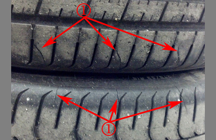 The surface cracks are cosmetic and will not result in a loss of air. However, they are damaging to the tire and cause a decrease in performance. Tires that have been used in cold climates and exhibit tread cracks (Fig. 3) should be discarded.
