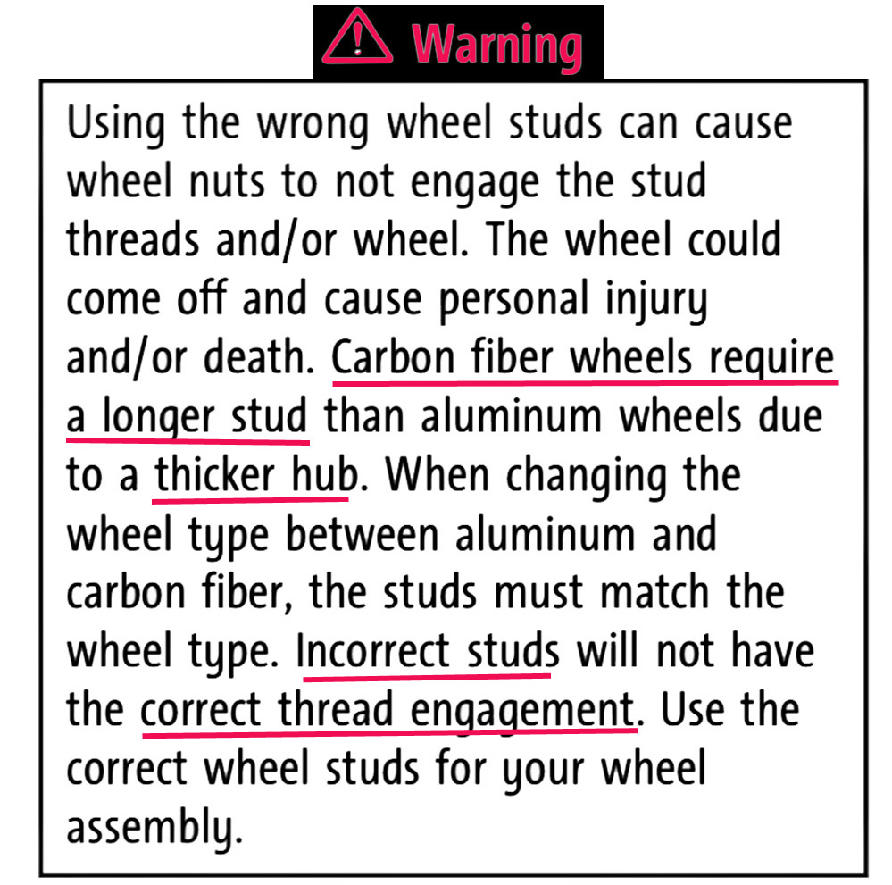 Due to hub thickness differences when buying a C8 Z06 or with Z07 and use of Carbon Fiber wheels is the stud lengths are different and must change the studs to proper length depending on if using CF wheels or other types