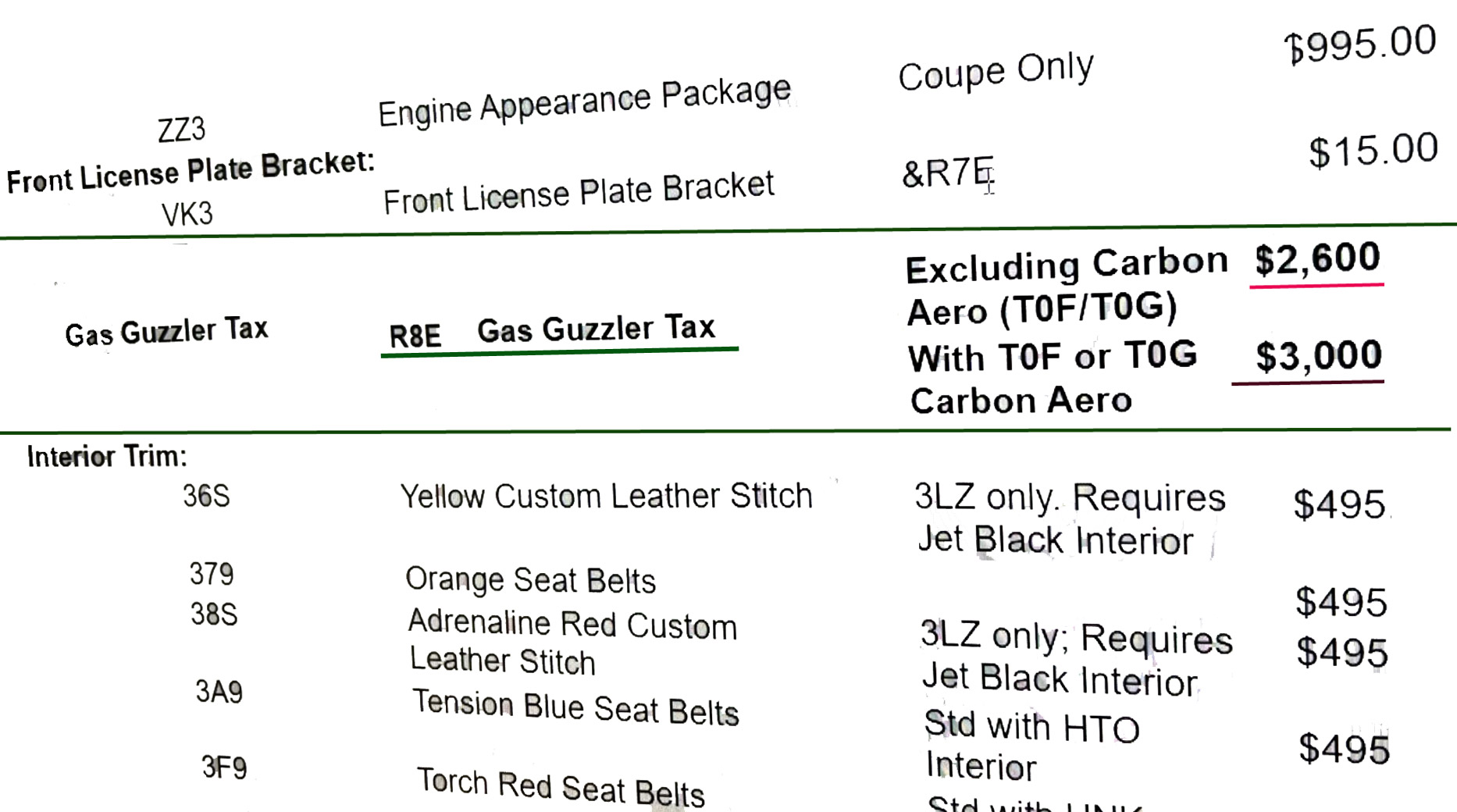 In buying the T0F/T0G Carbon Fiber aero option (is required for the Z07 performance package), the gas guzzler tax goes up to $3,000.
