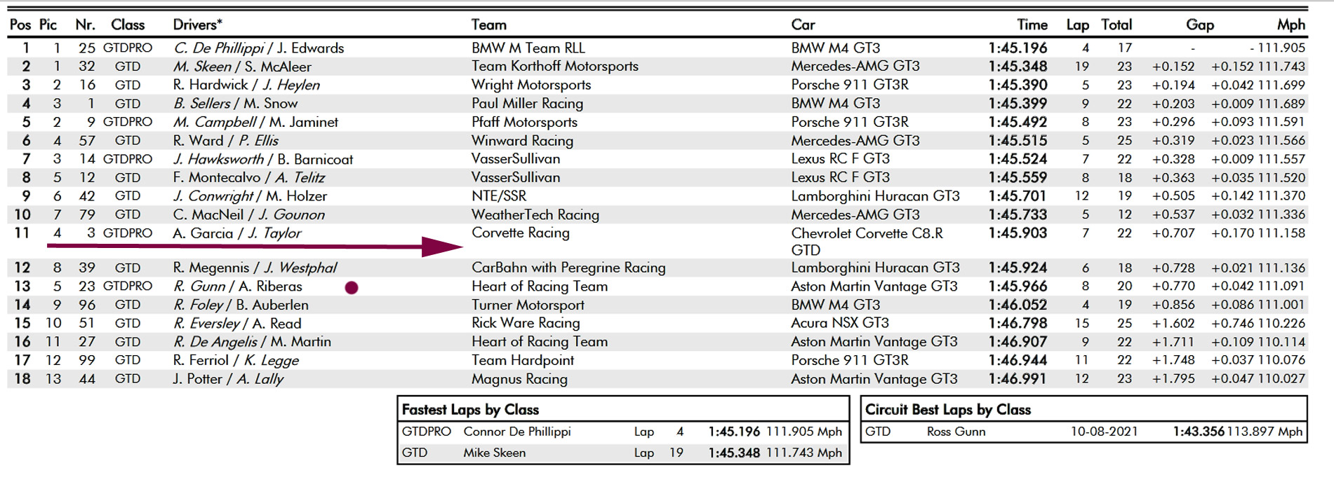 Team Standings 1. No. 9 Pfaff Motorsports – 2.793 2. No. 14 VasserSullivan – 2,566 3. No. 3 Corvette Racing – 2,566 4. No. 23 Heart of Racing Team – 2,476 5. No. 25 BMW Team RLL – 2,234